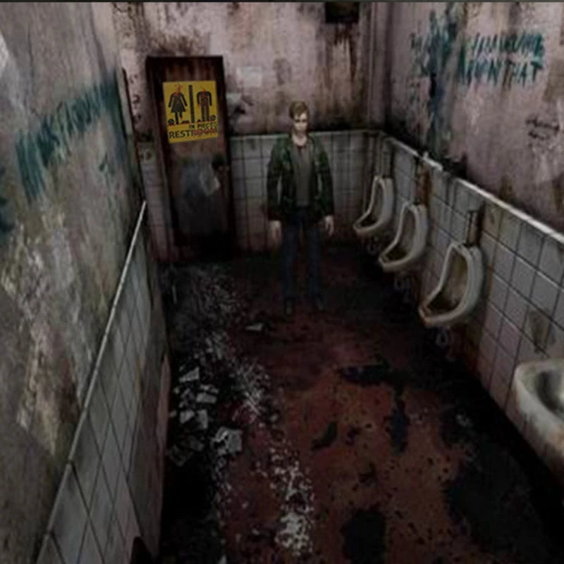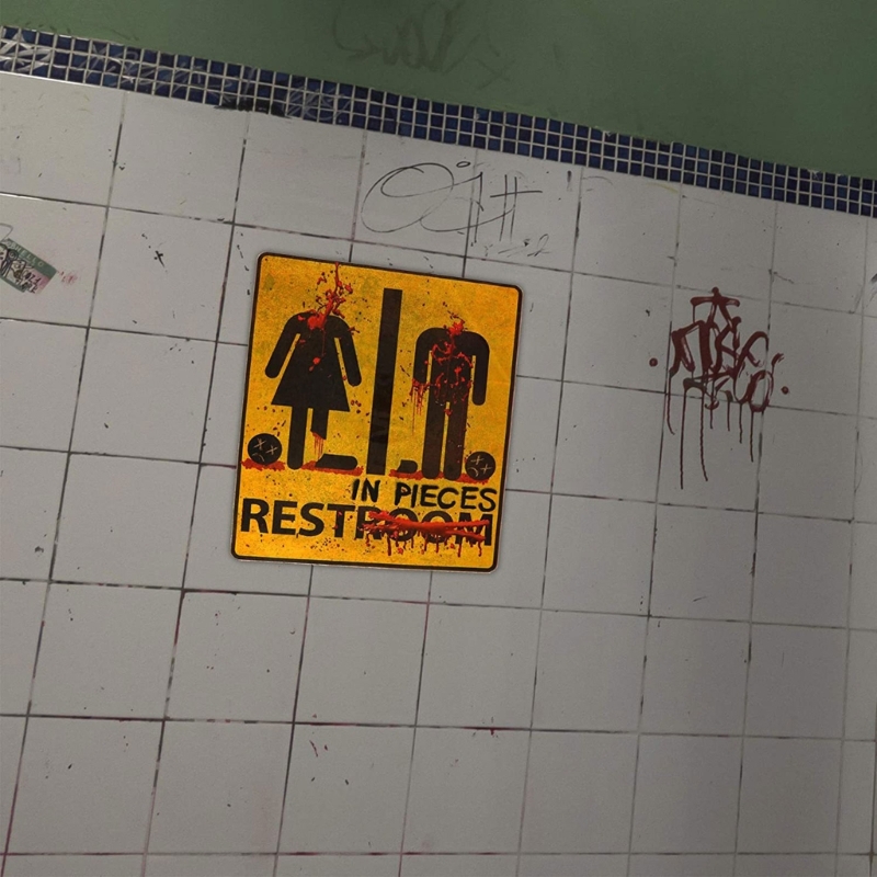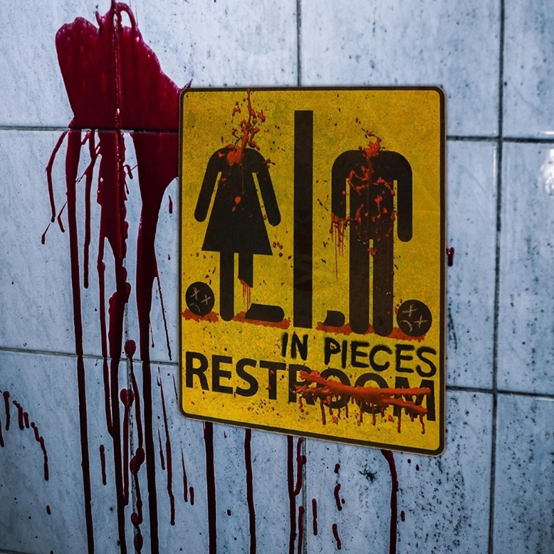 Donnez à vos invités un comme ils cherchent les toilettes. Une femme démembrée et l'homme symbole sur un signe taché de sang qui changent le mot "toilettes" à "Rest in Piece".