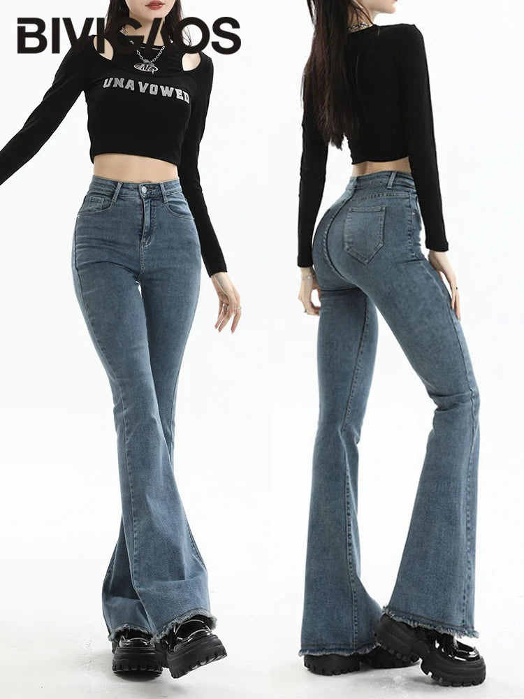 BIVIGAOS 2025 nouveau automne printemps Micro jean évasé femmes taille haute mince serré rétro gland ourlet Stretch Denim fer à cheval pantalon