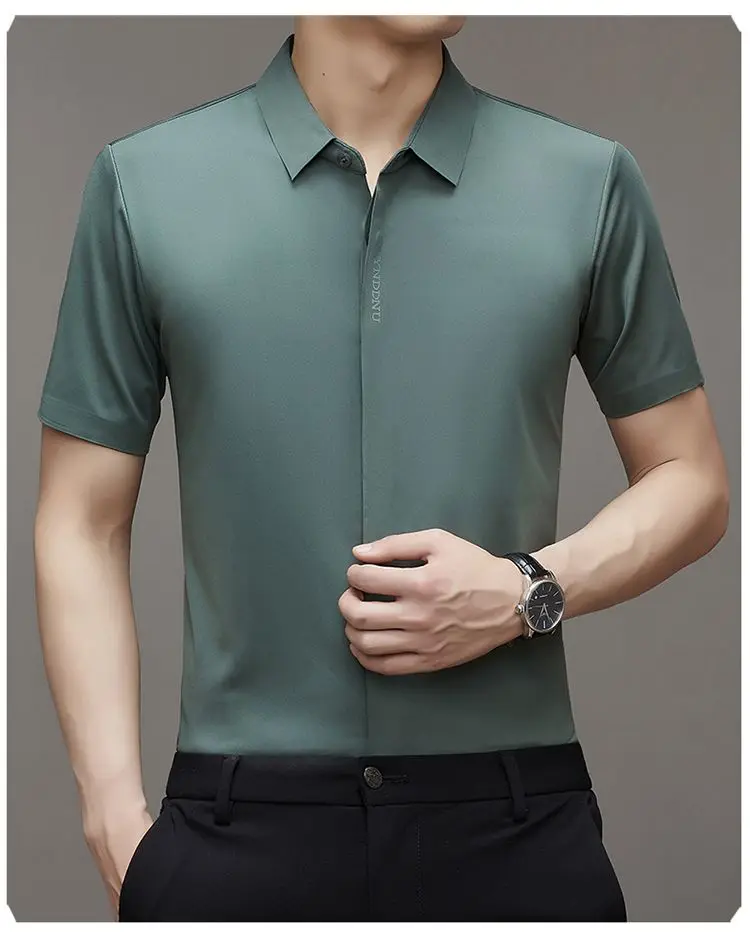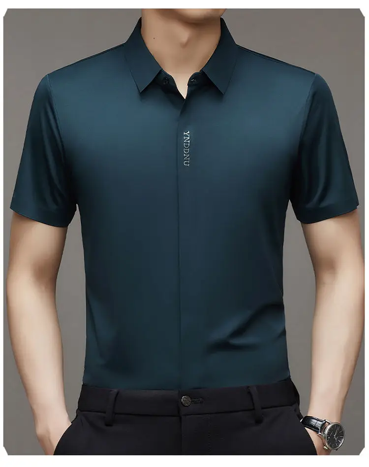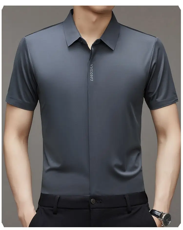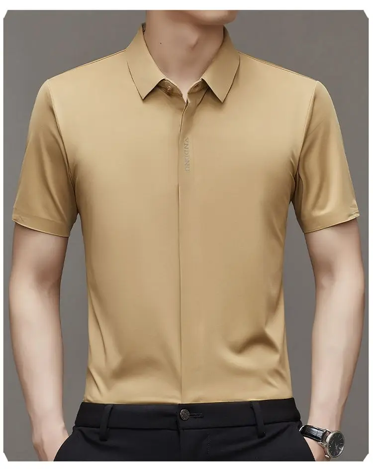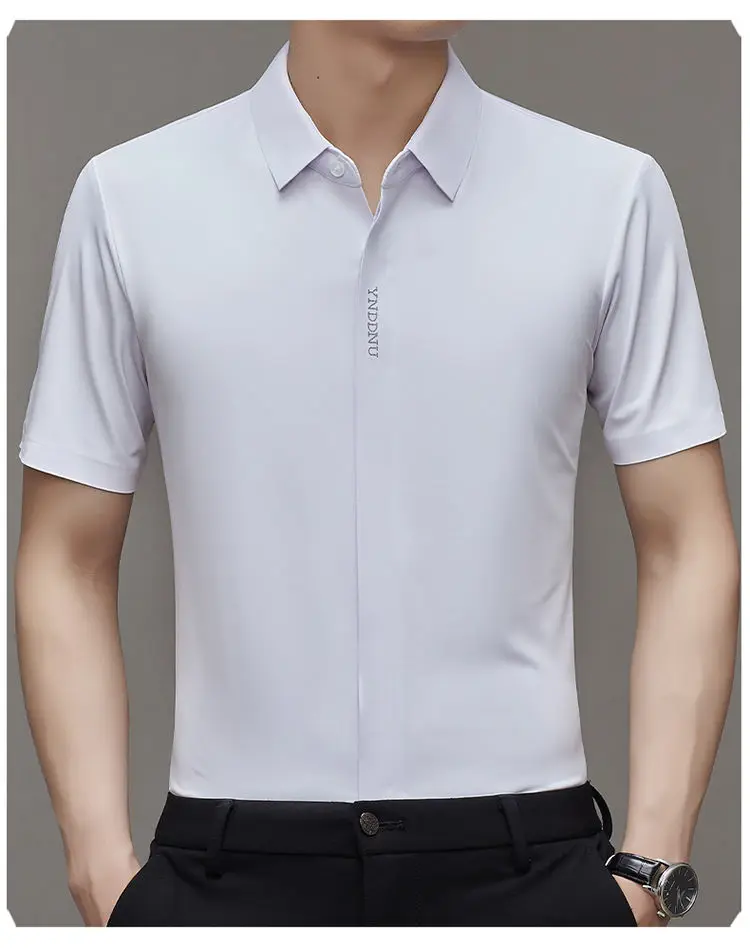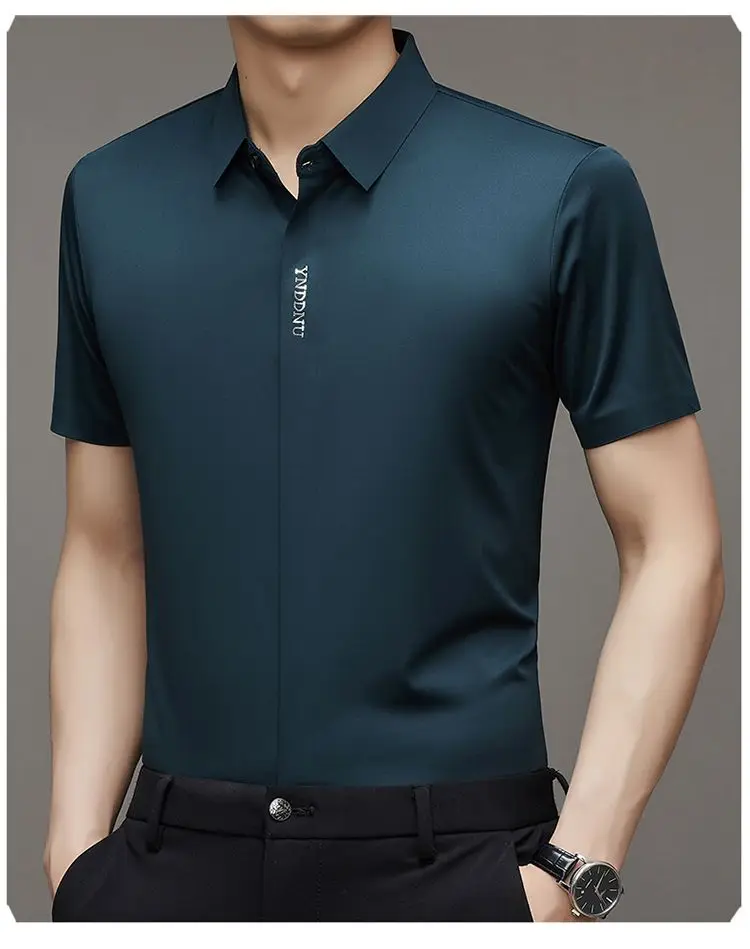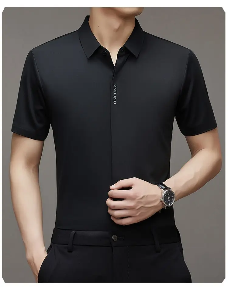 Chemise d'été intelligente et décontractée à manches courtes pour hommes, couleur unie, col carré, boutons brodés, lettre haut de gamme, résistant aux rides