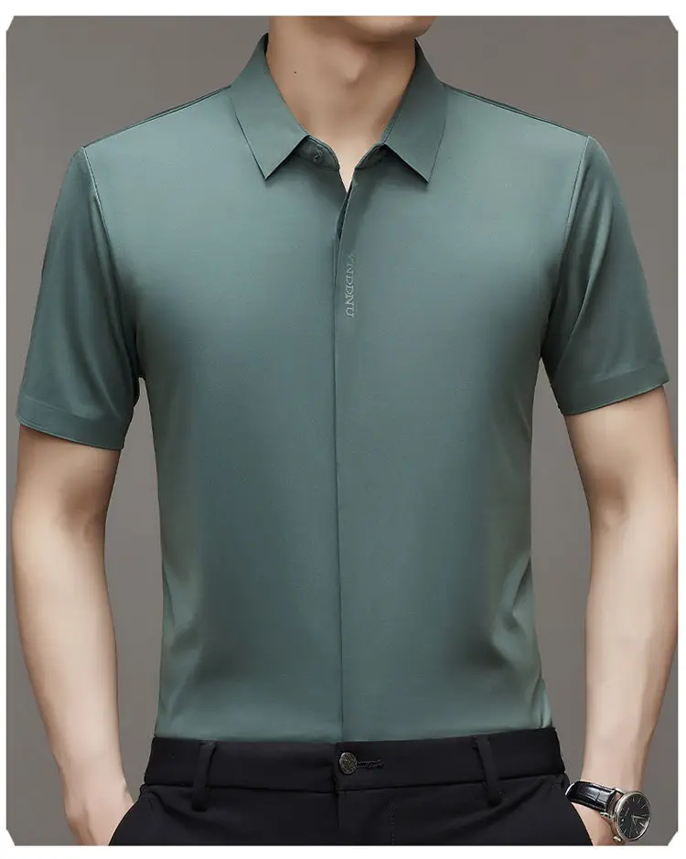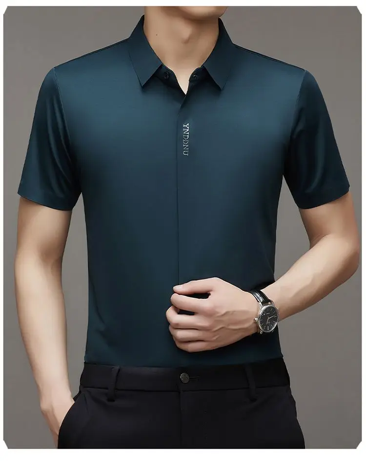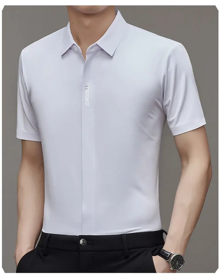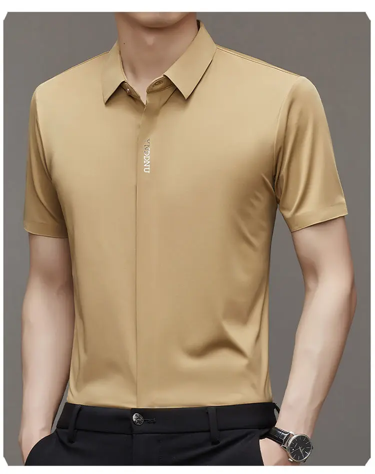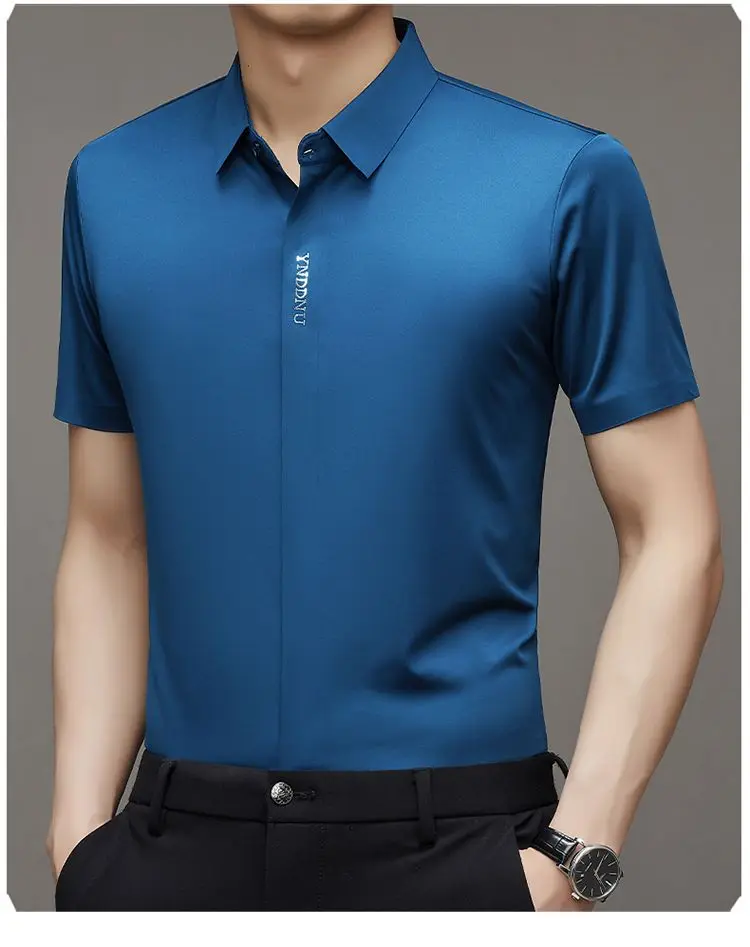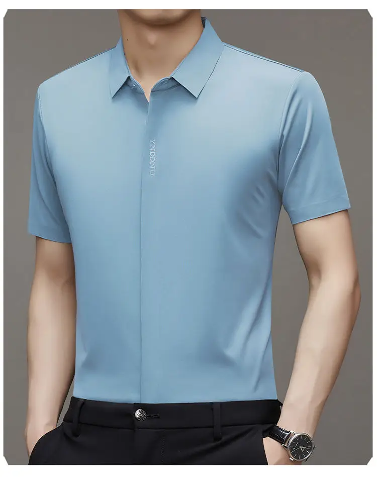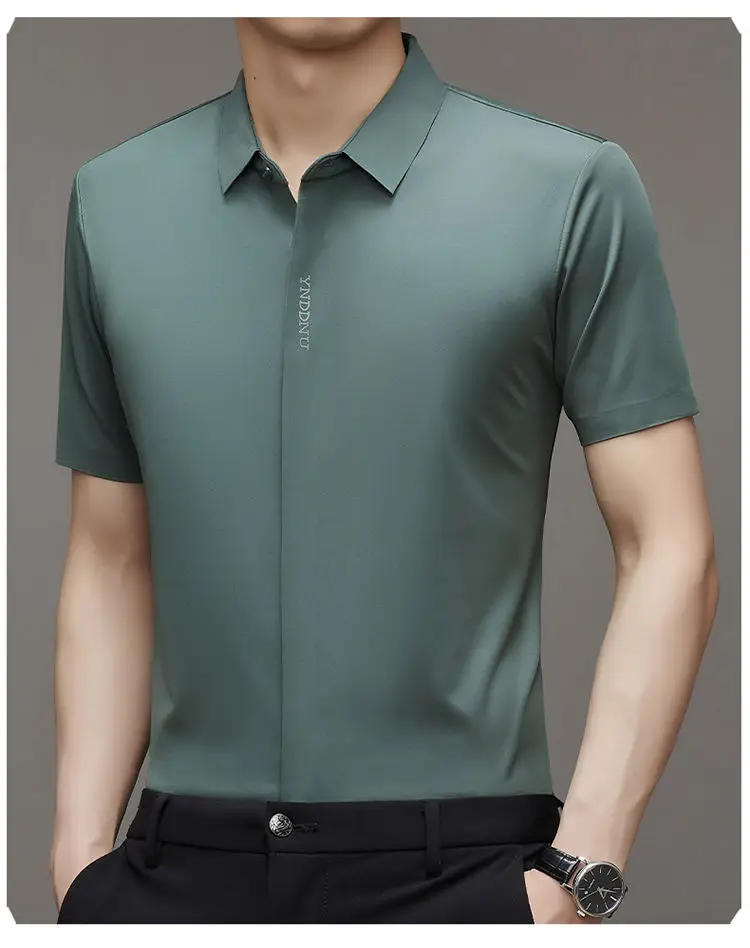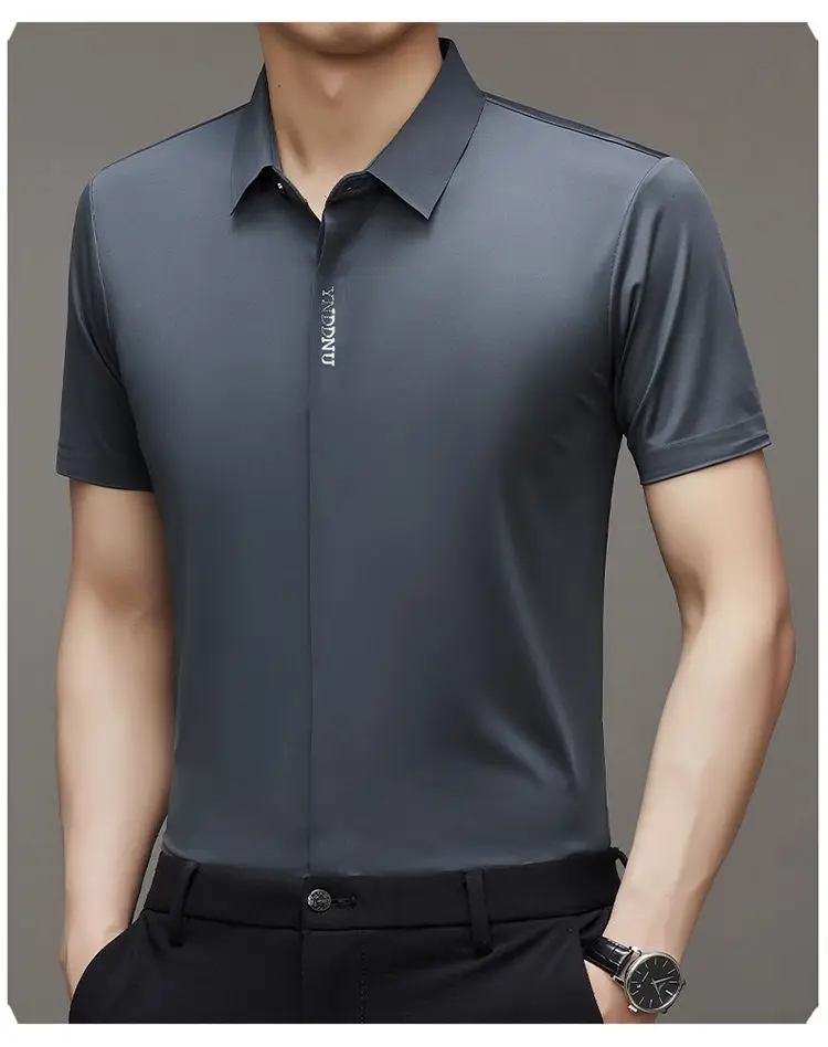 Chemise d'été intelligente et décontractée à manches courtes pour hommes, couleur unie, col carré, boutons brodés, lettre haut de gamme, résistant aux rides