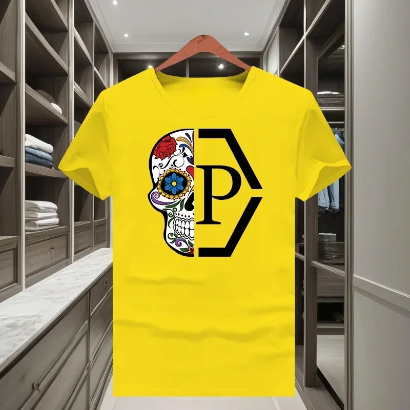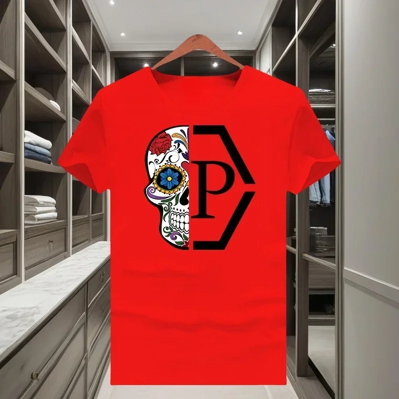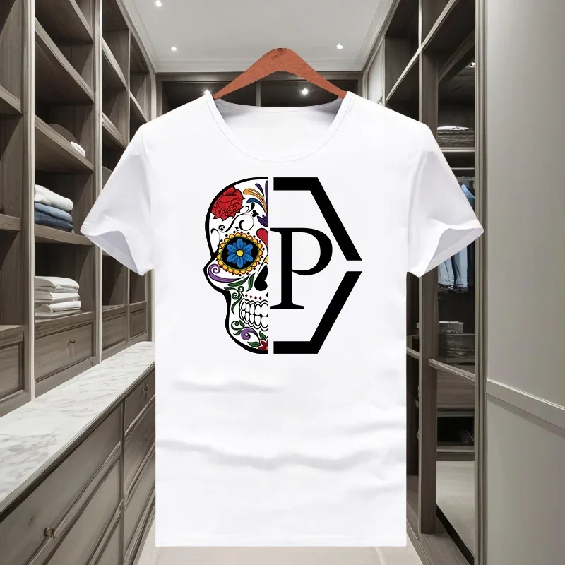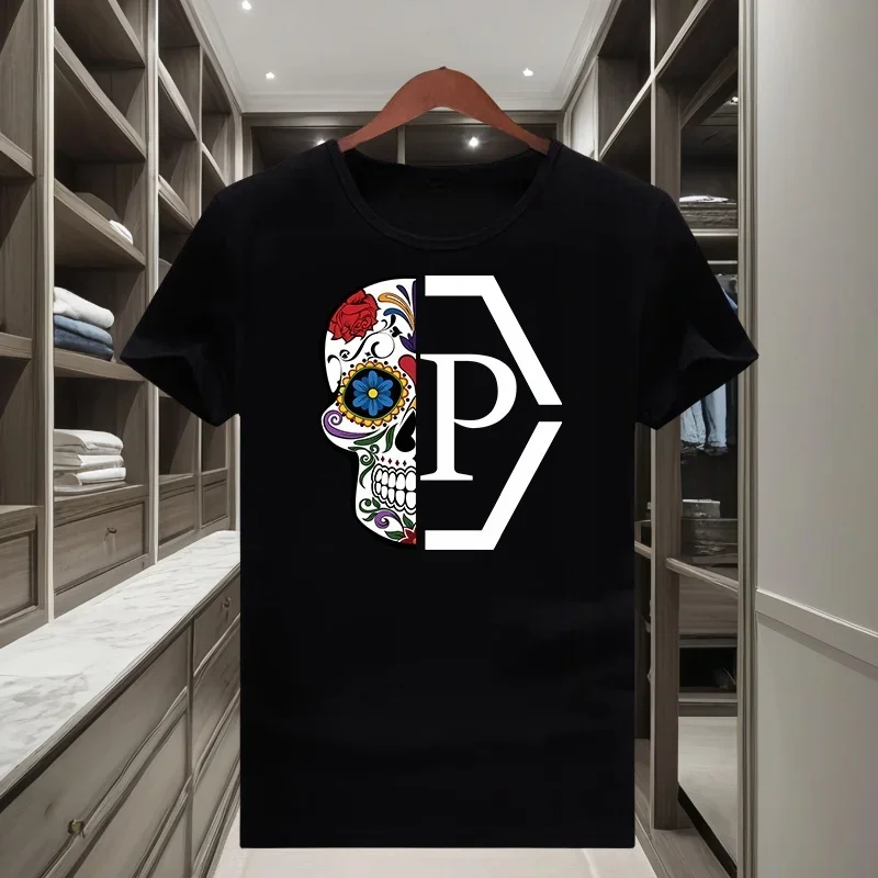 Classique à la mode marque demi crâne fleur imprimé hommes et femmes 2025 nouveau T-shirt à manches courtes col rond