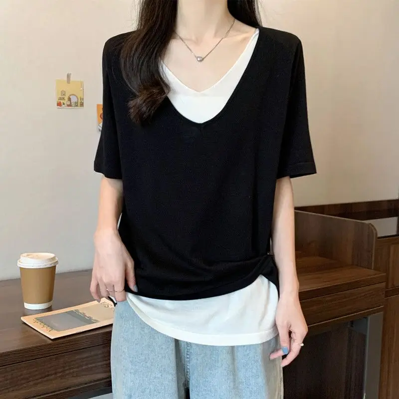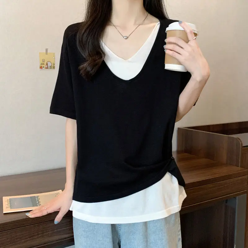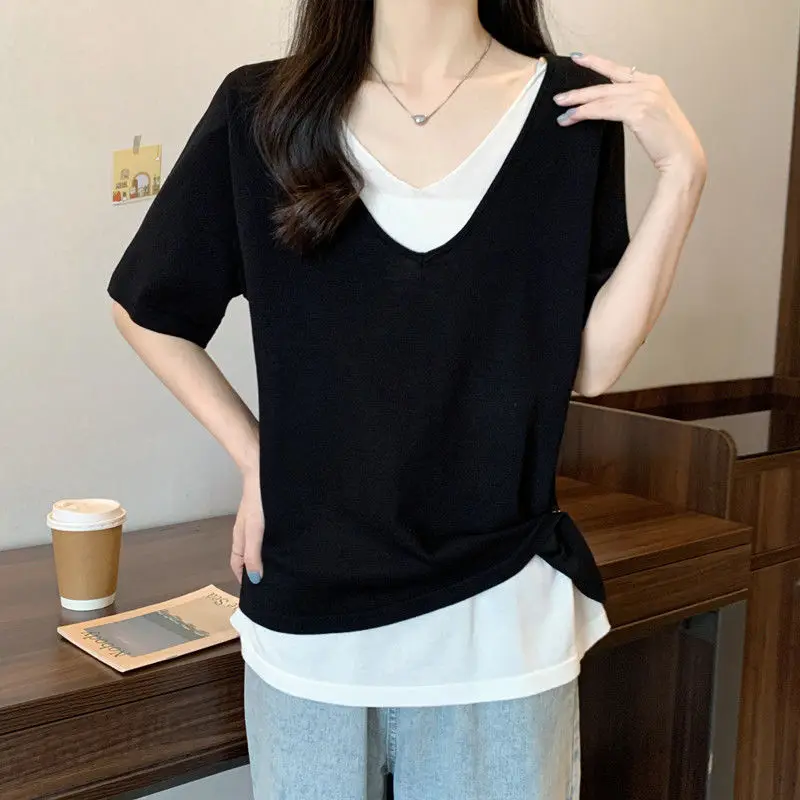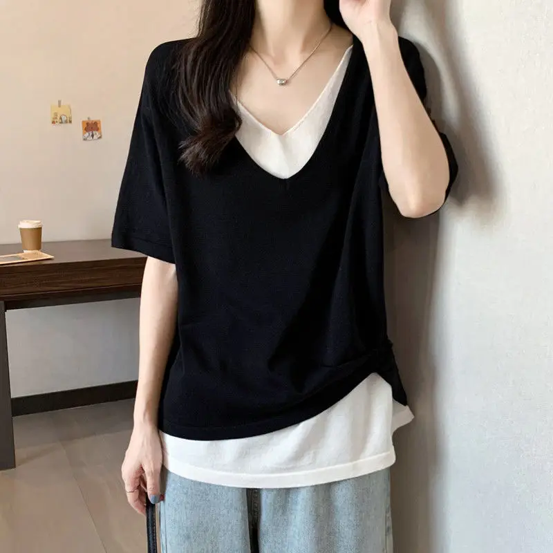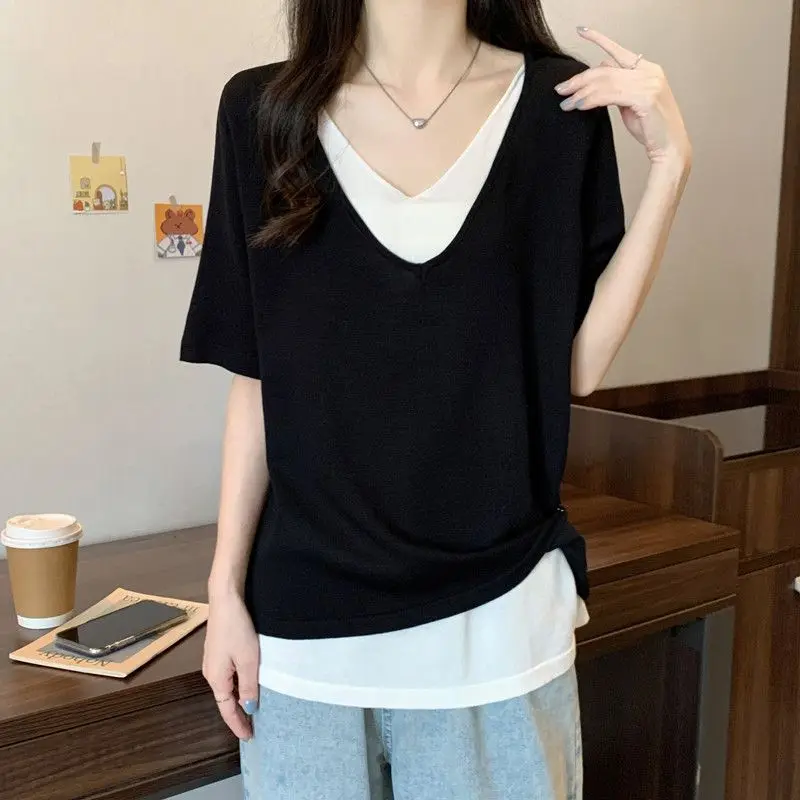 Économie à manches courtes et col en V pour femmes, pulls élégants, patchwork de documents solides, vêtements décontractés, mode sexy, simplicité, 2023