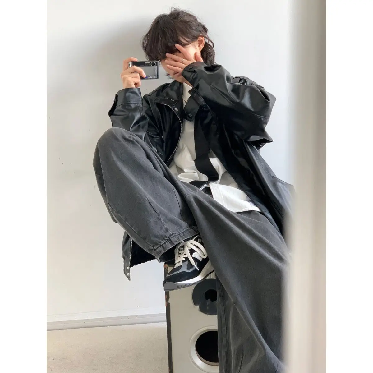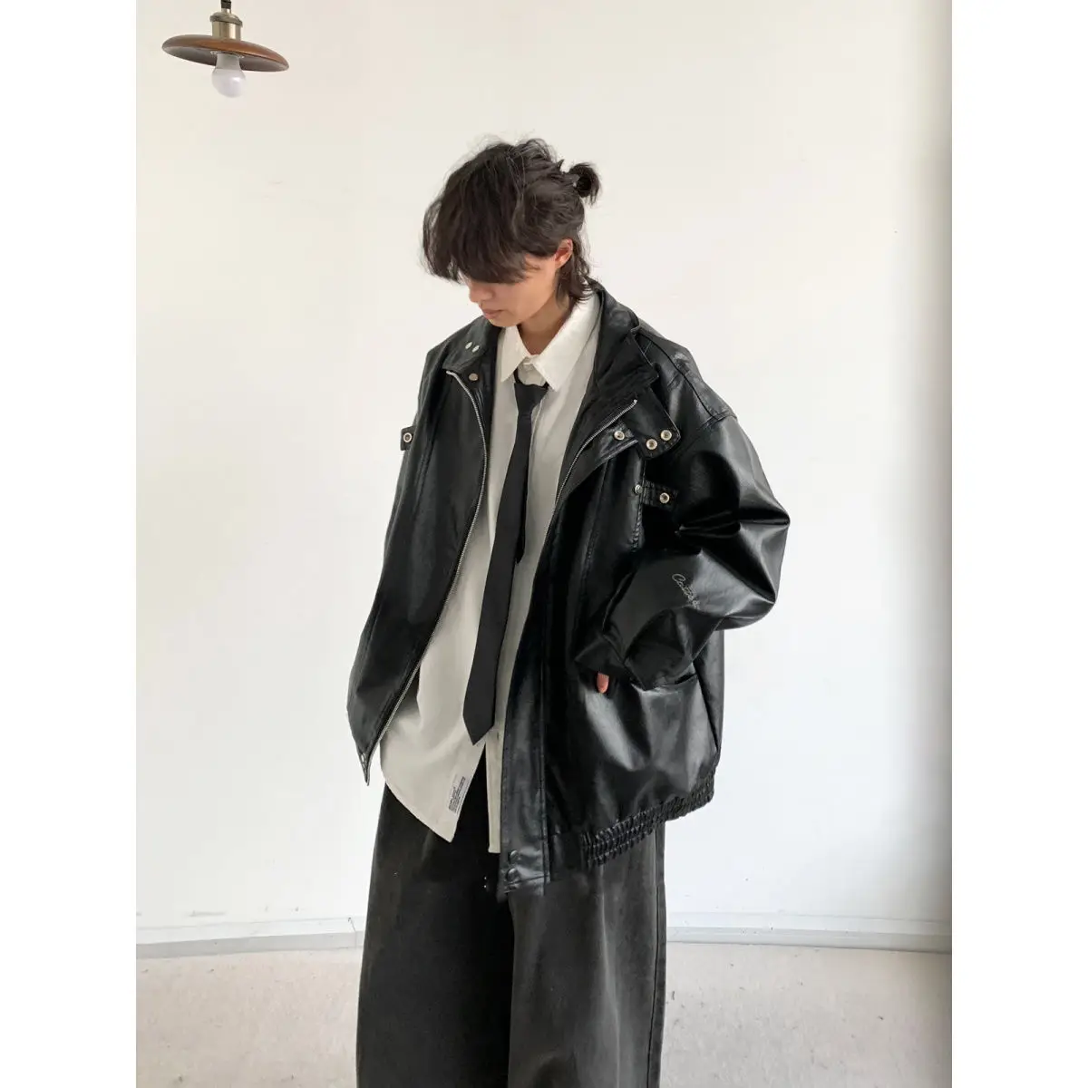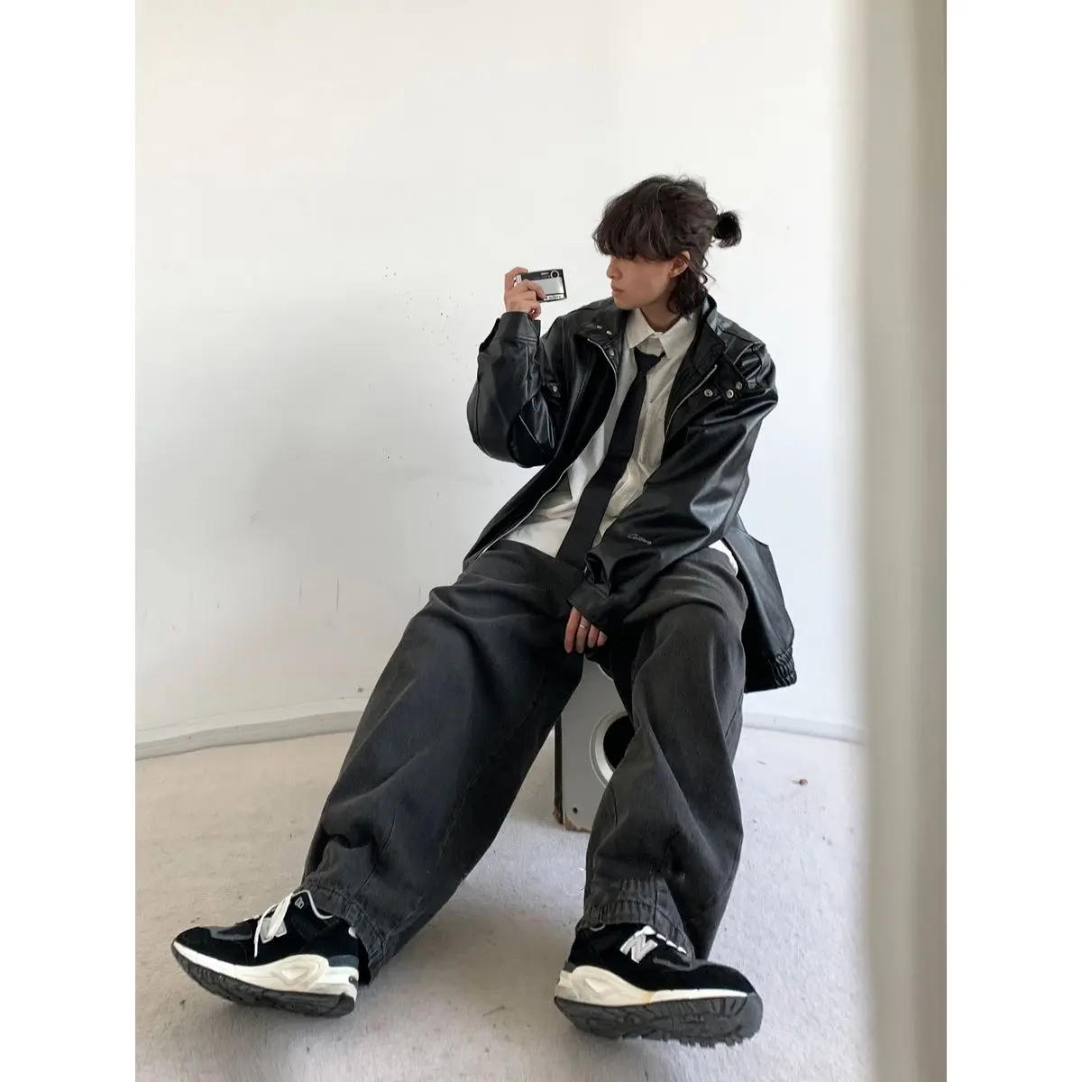 Ensemble rétro 3 pièces pour hommes et femmes, veste en cuir Pu coréenne ample, jean droit, chemises blanches à manches longues, costumes décontractés de rue
