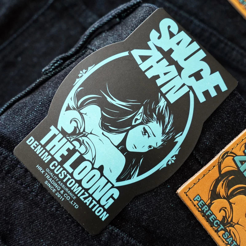 Jean commémoratif de l'année du dragon, il utilise une étiquette en cuir teint bicolore, une image vive du motif de fille dragon et un tissu teint bleu et vert sur le thème du dragon bleu.