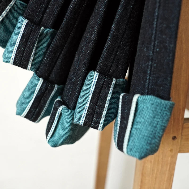 Tissu : 98 % coton à fibres longues et 2 % élasthanne, 15 oz en denim selfvedge teint double face, connu pour sa robustesse et sa résistance à l'abrasion.