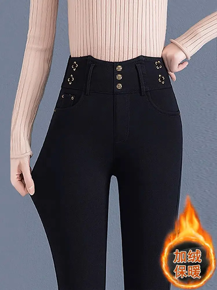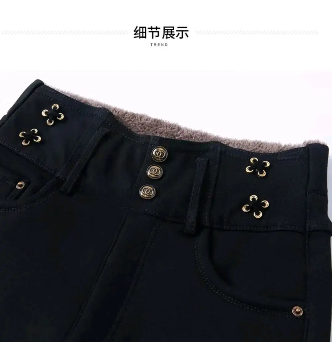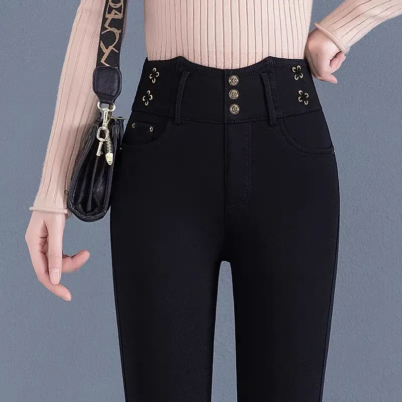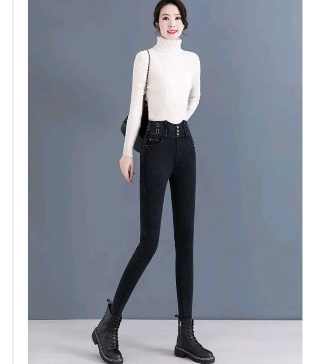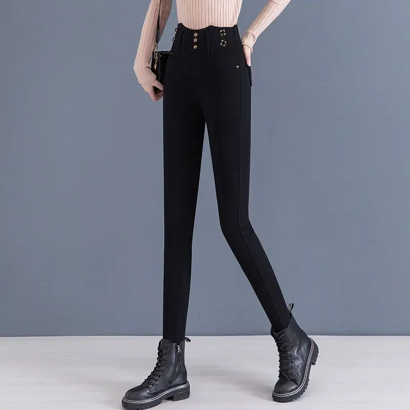 Jean taille haute élastique coréen avec peluche arctique, pantalon crayon droit noir mince, bouton solide, fermeture éclair, mode automne et hiver, nouveau