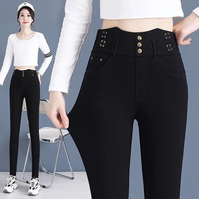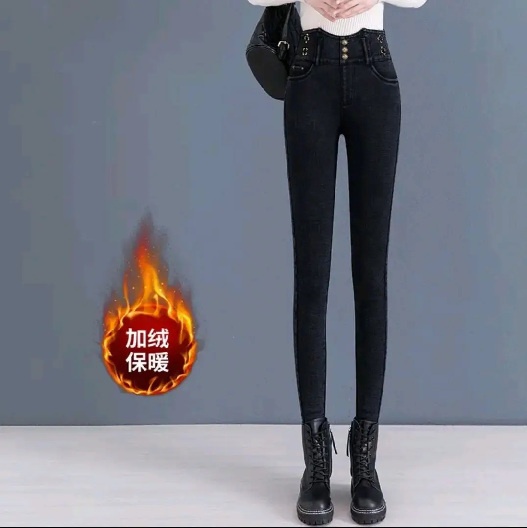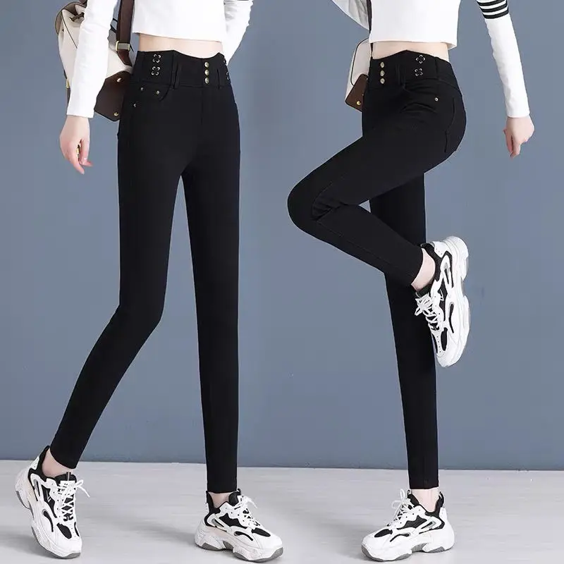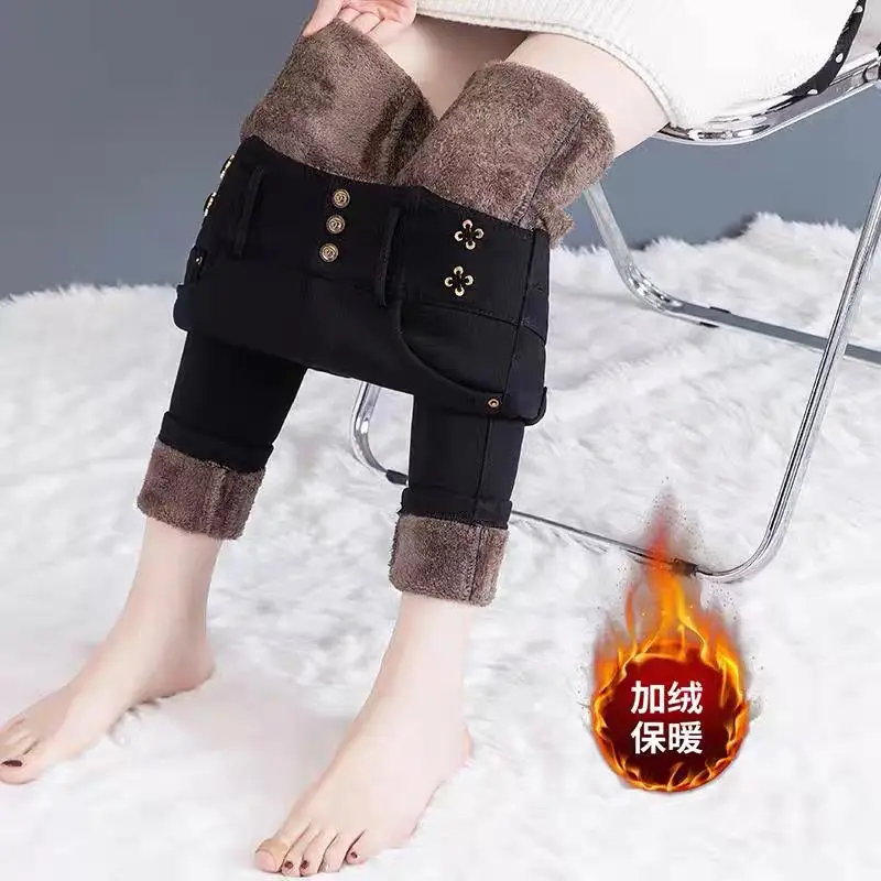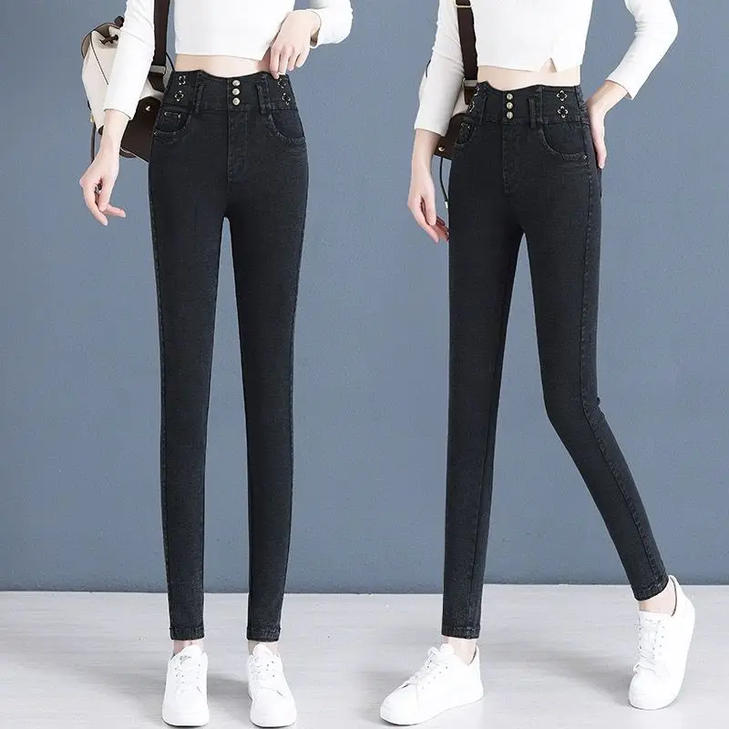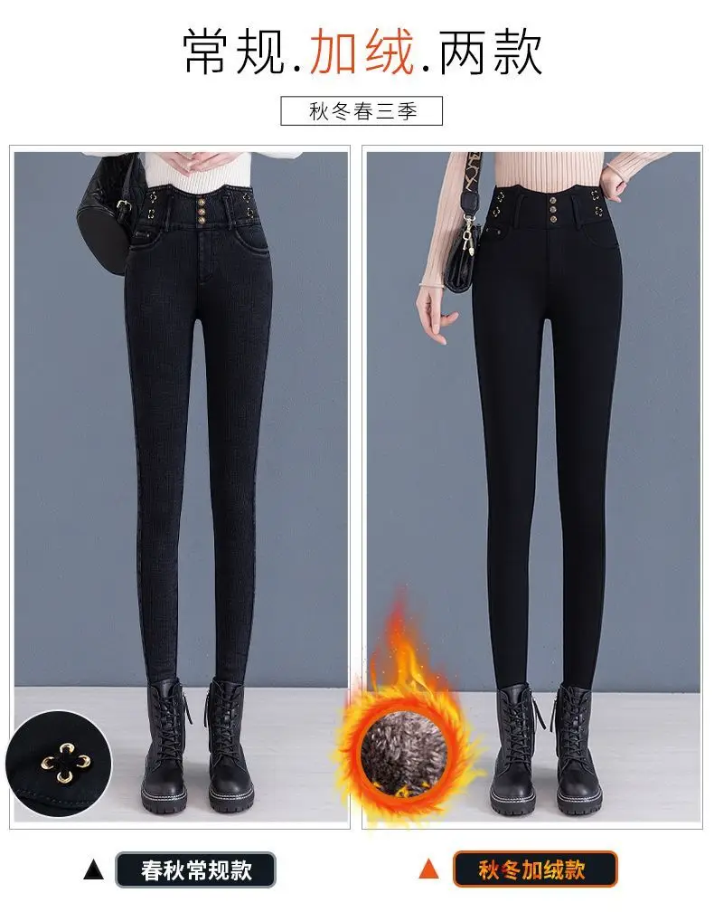 Jean taille haute élastique coréen avec peluche arctique, pantalon crayon droit noir mince, bouton solide, fermeture éclair, mode automne et hiver, nouveau