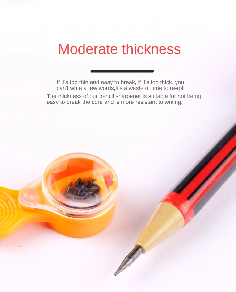 3.Trop fin et facile à casser.S'il est trop épais, vous ne pourrez pas écrire quelques mots et vous devrez le dérouler pour perdre du temps.Notre taille-crayon convient pour ne pas casser facilement le noyau et il est plus résistant à l'écriture.