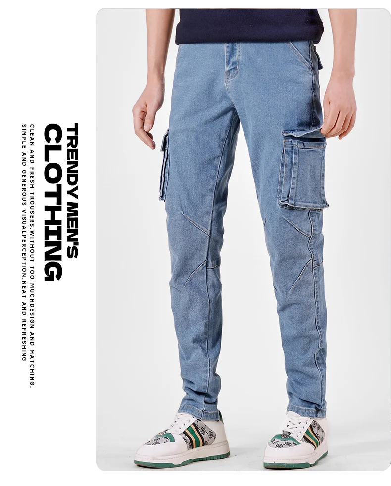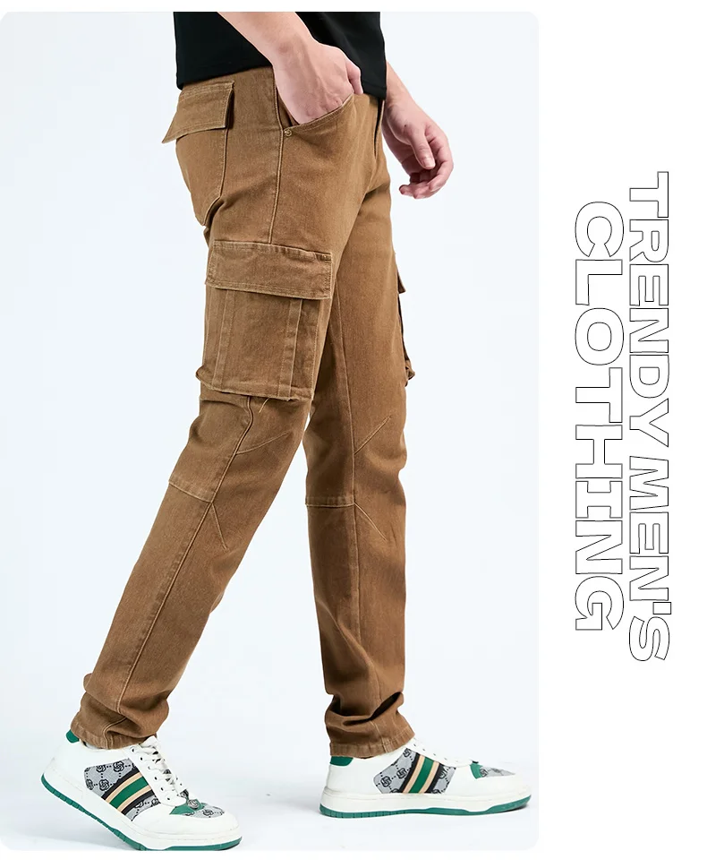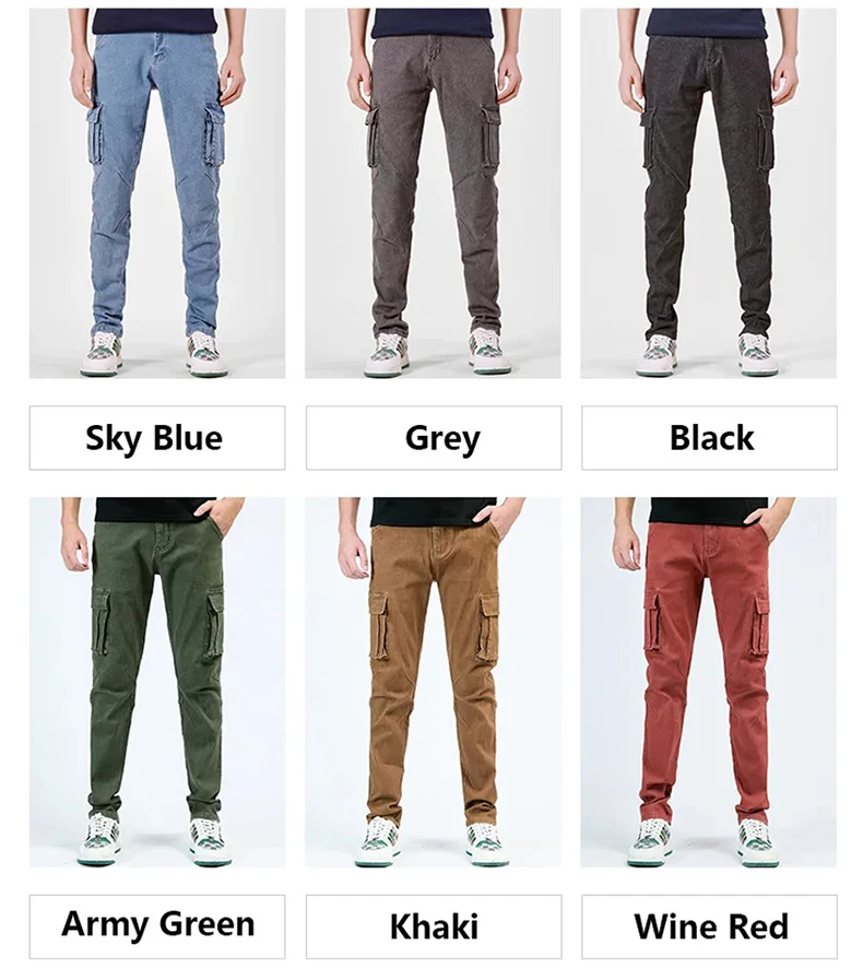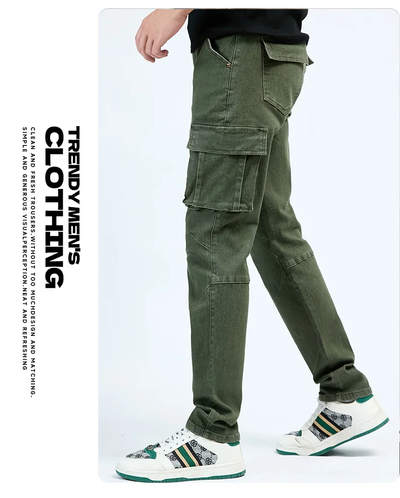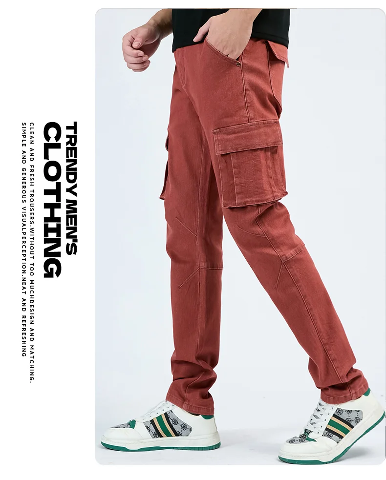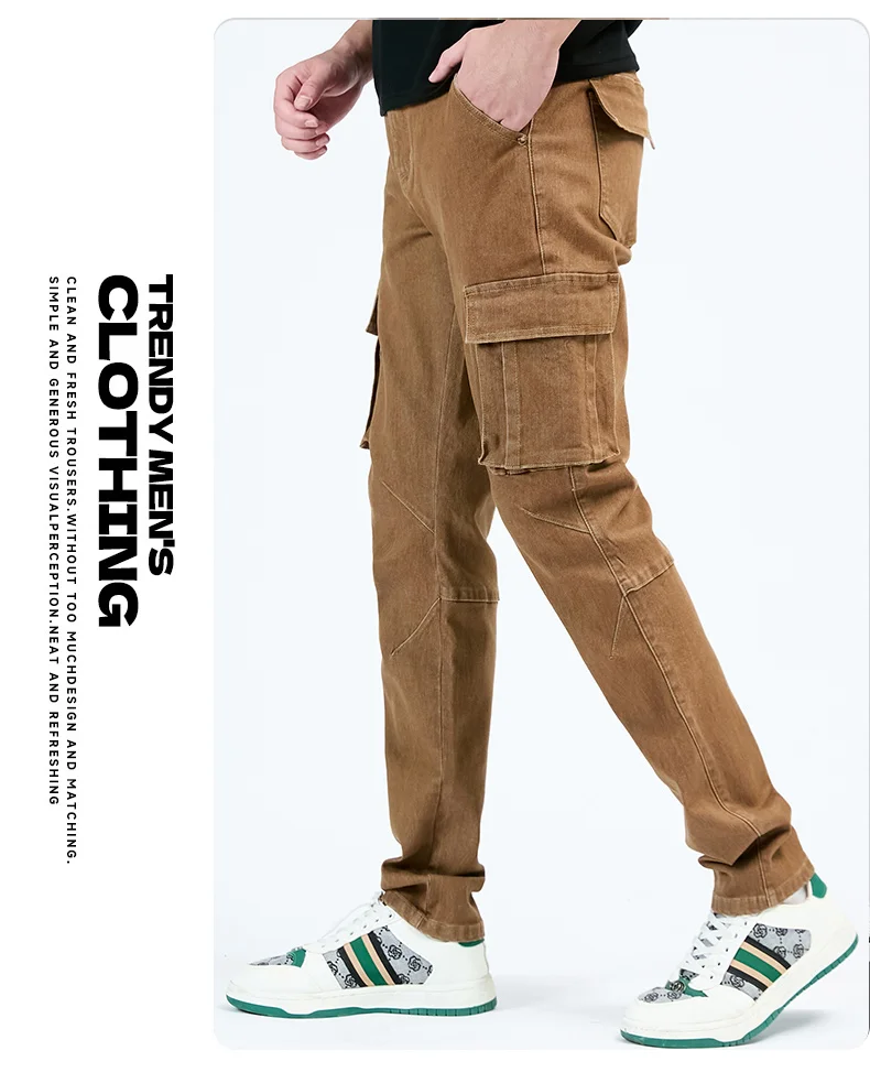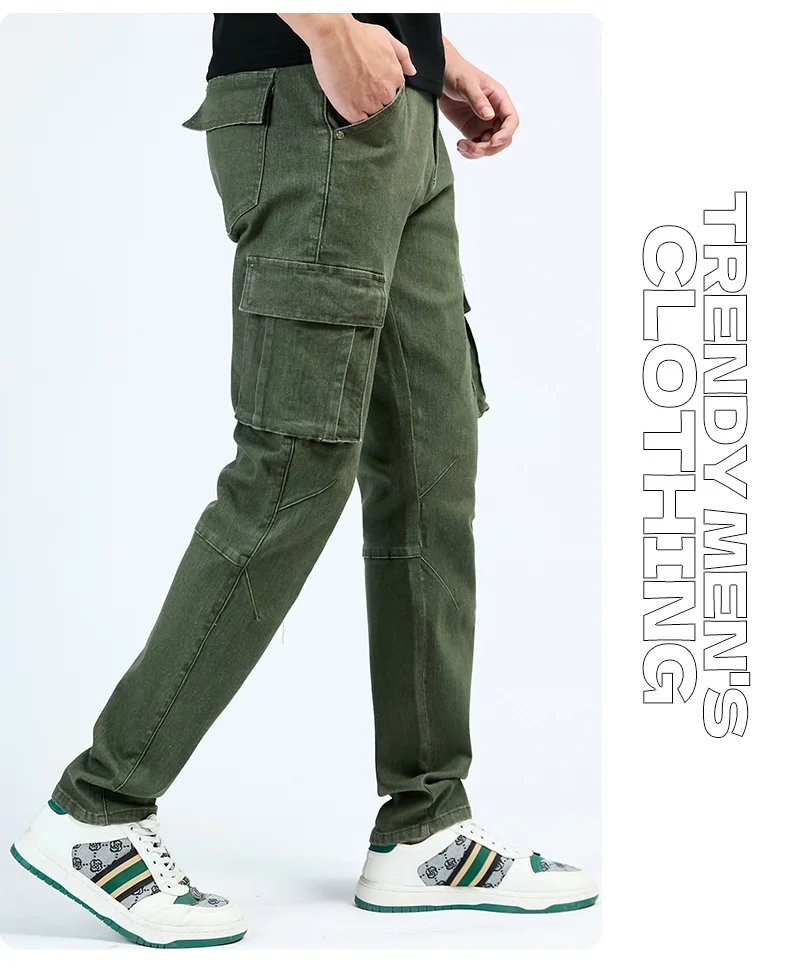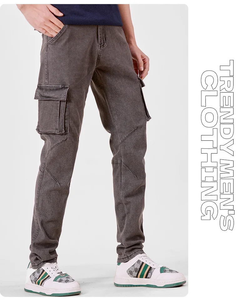 Pantalon cargo en denim pour hommes, taille élastique, couleur unie, délavé, coupe cintrée, décontracté, avec plusieurs poches, pour un usage quotidien