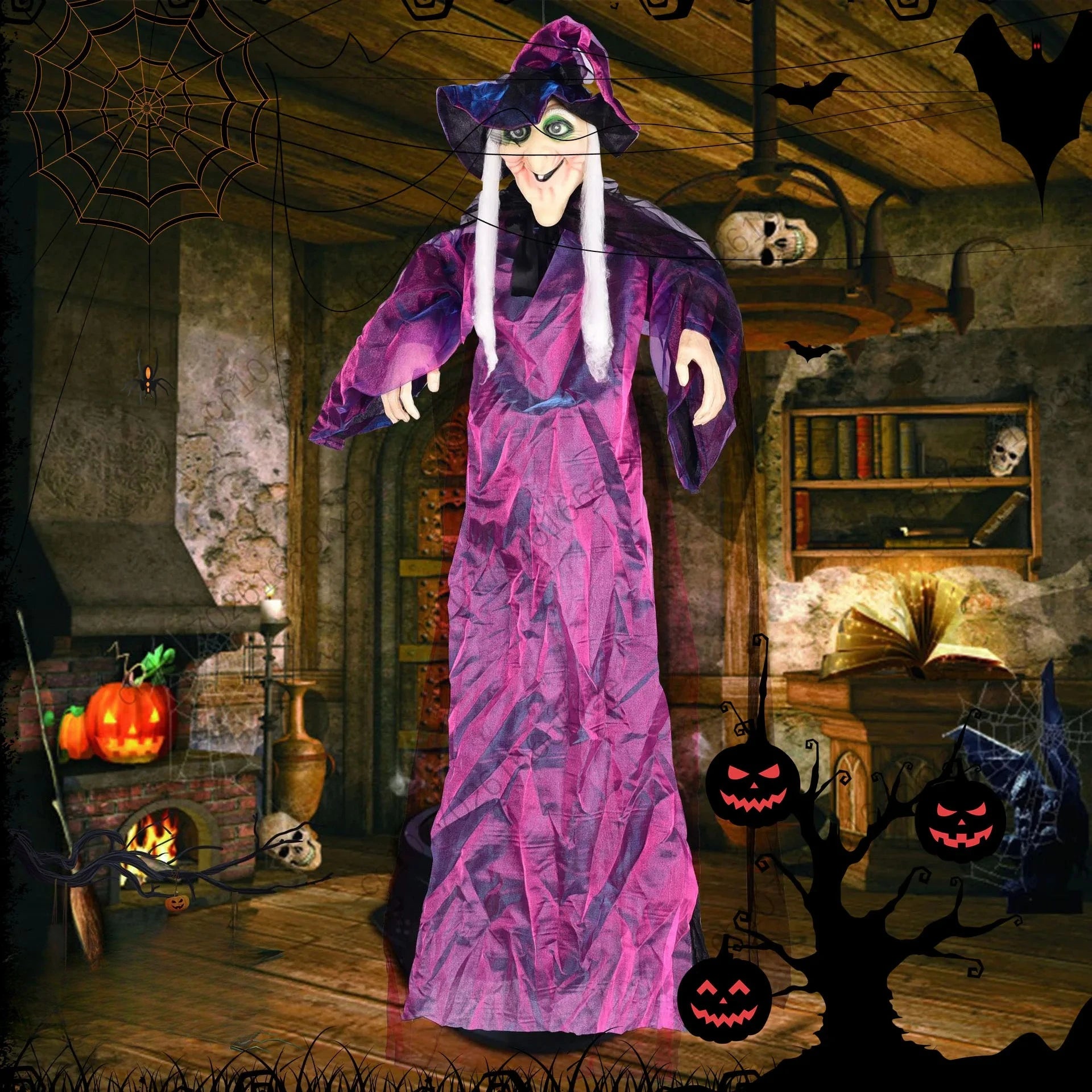 Détails de l'animation : la sorcière animée comprend des fonctionnalités interactives qui ajoutent à l'effroi général.Lorsqu'ils sont activés, les yeux de la sorcière s'allument et cela commence à parler d'une voix effrayante.Effets d'éclairage, ajoutant au réalisme et en faisant un accessoire parfait pour effrayer vos amis et votre famille