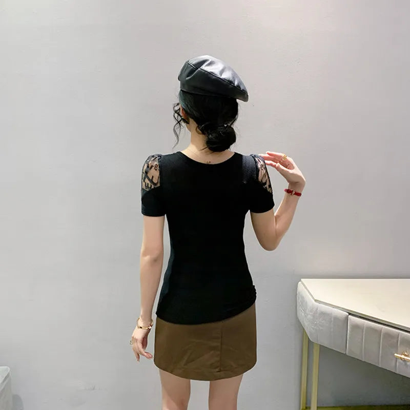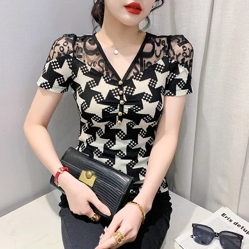 T-shirt évidé à manches courtes pour femmes, col en V boutonné, patchwork de dentelle sexy, t-shirts d'été, vêtements chics, nouveau design