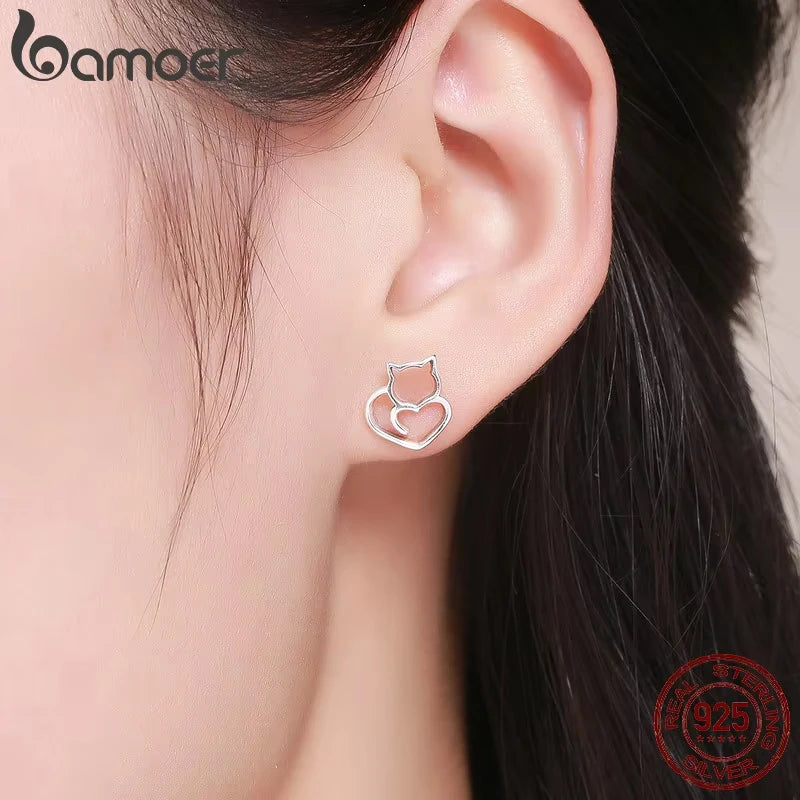 BAMOER-Boucles d'oreilles chat mignon en argent regardé 925 pour femme, bijoux authentiques, petit clou, mode, SCE271