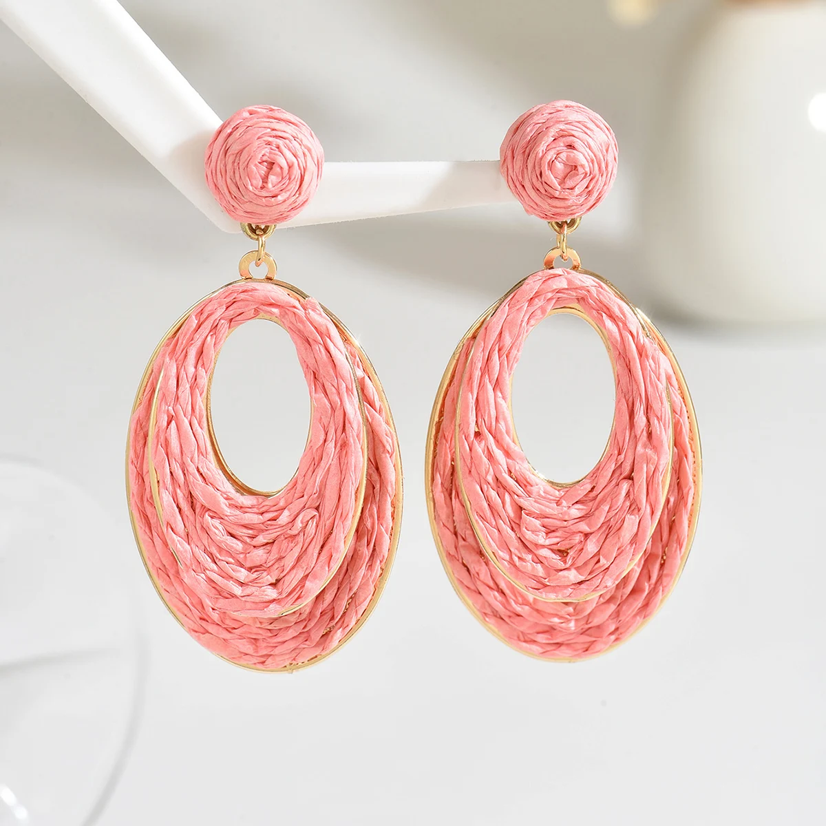 Boho tendance fait à la main Double couche ovale en raphia boucles d'oreilles pour les femmes élégant rotin tricot boucles d'oreilles bijoux d'été cadeaux