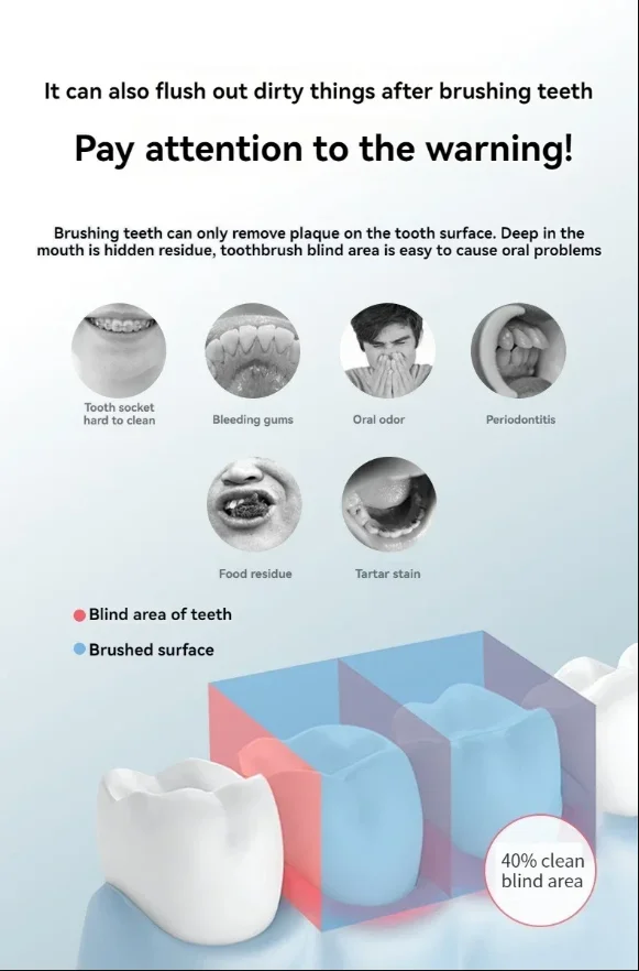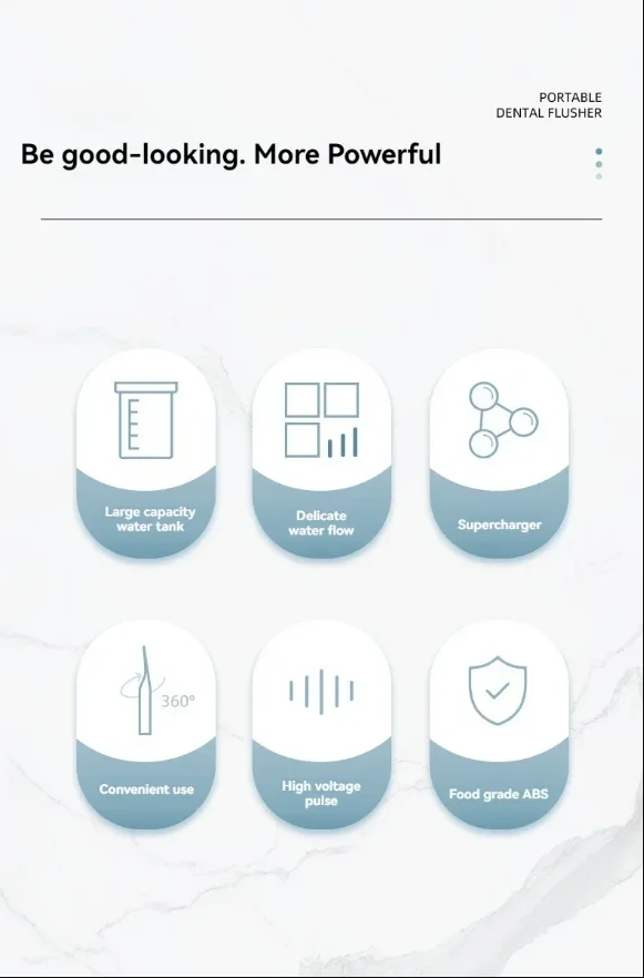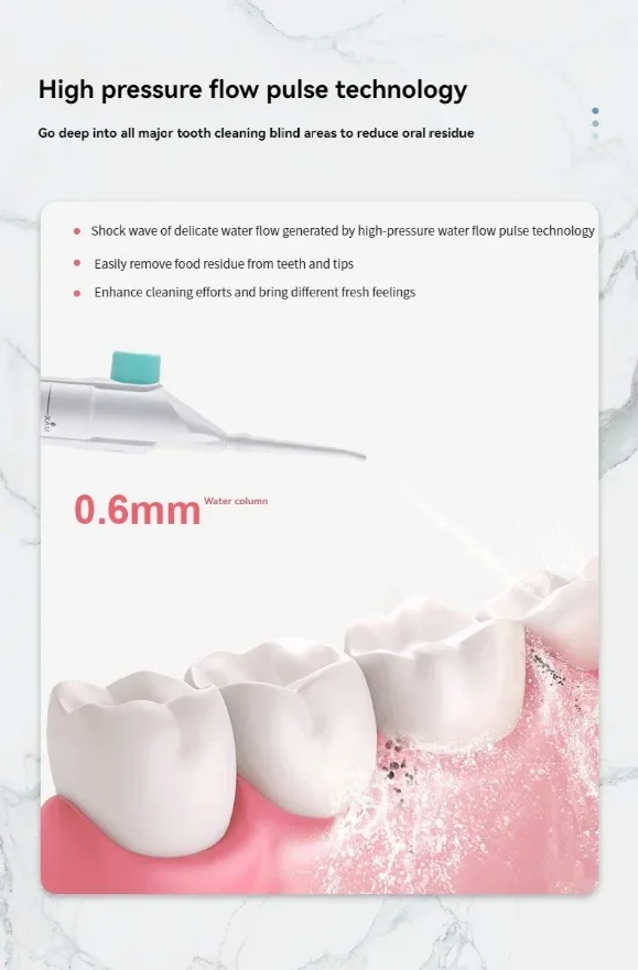 • Irrigateur oral haute pression : Cet outil dentaire portable nettoie efficacement vos dents, atteignant les zones qui ne peuvent pas brossage, prévenant ainsi les carités et les maladies des gencives.