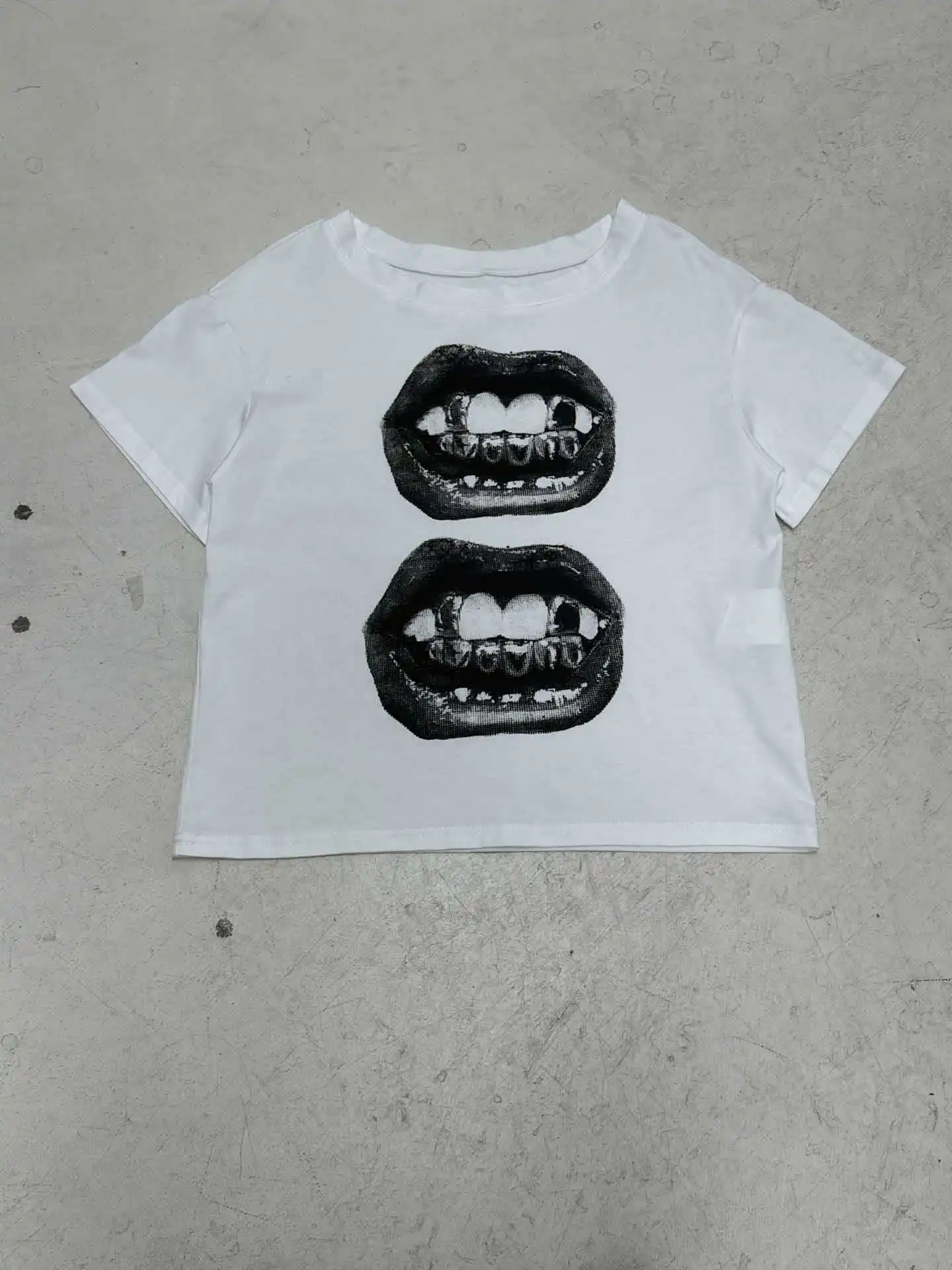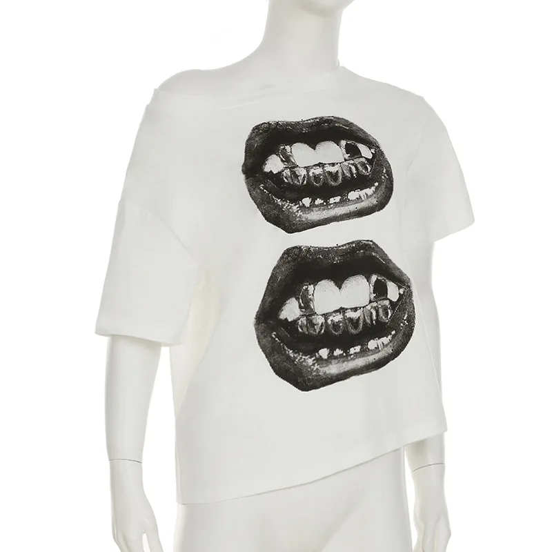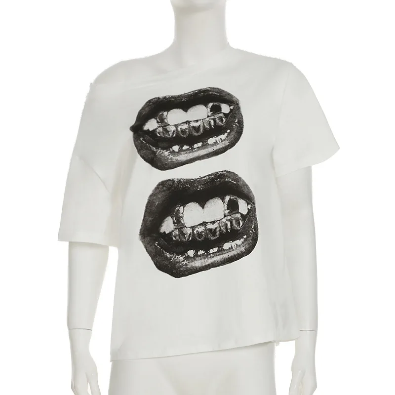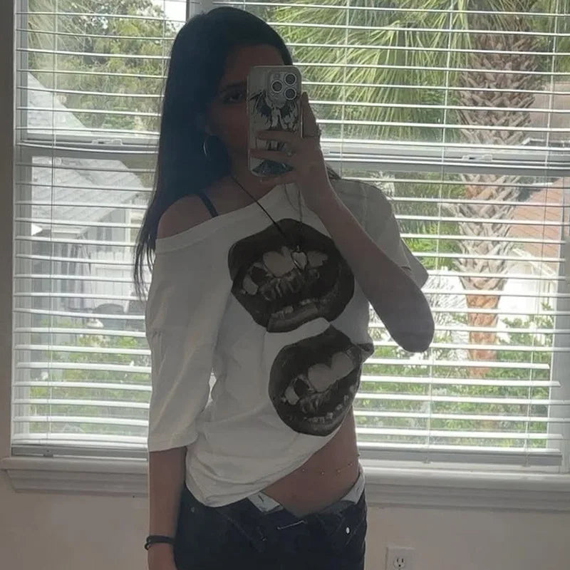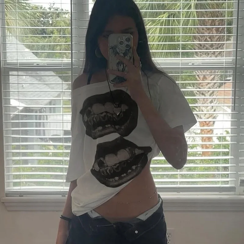 Rue hip hop style bouche impression simple épaule lâche t-shirt style décontracté été contraste couleur mince sexy hors épaule vêtements