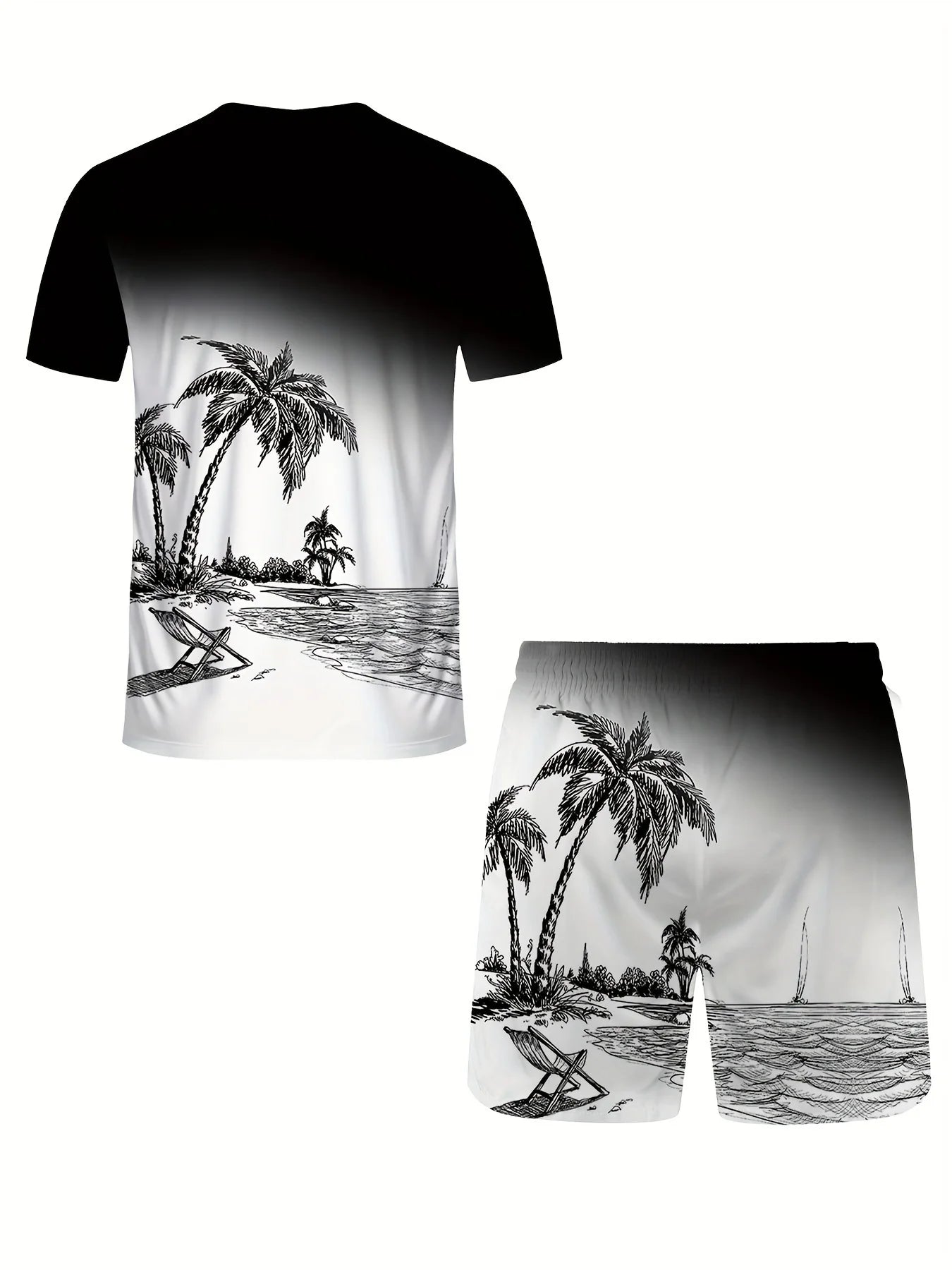 Série d'été hommes dégradé cocotier imprimé respirant col rond T-shirt ensemble short et haut extérieur deux pièces ensemble