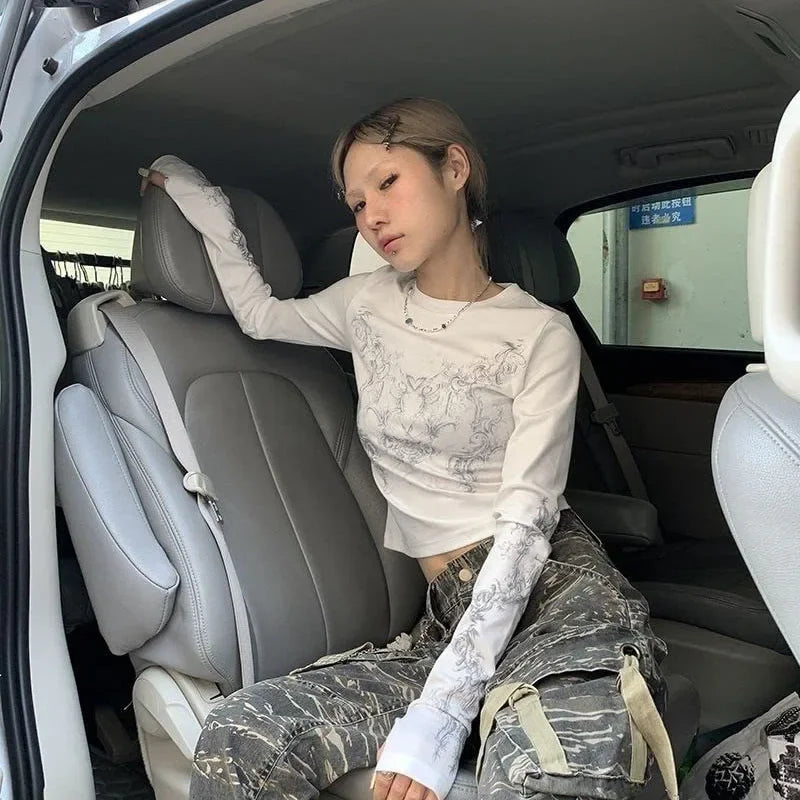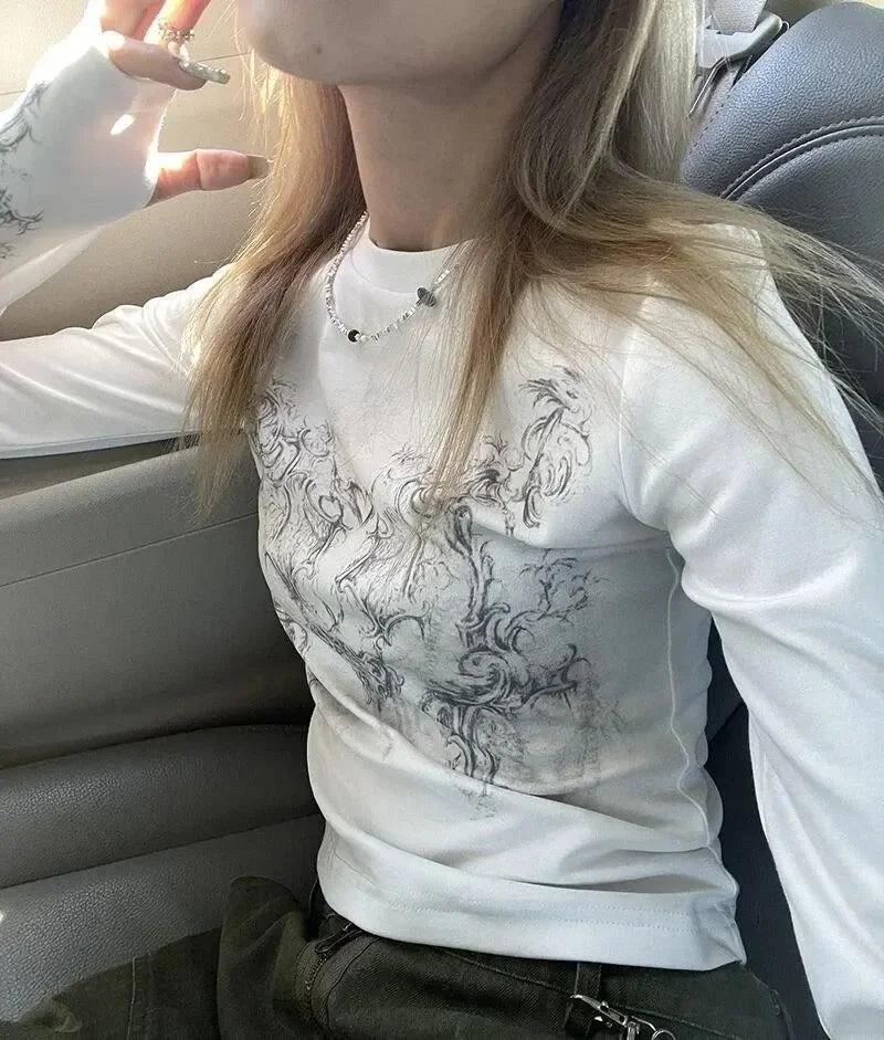 T-shirt à manches longues pour femmes, haut patchwork sexy, t-shirts col rond, tunique imprimée à manches longues, t-shirt streetwear