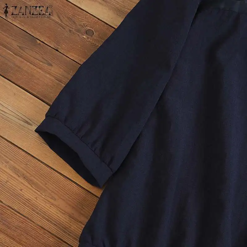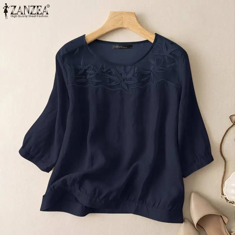 ZANZEA-Chemisier à Manches 3/4 et Col Rond pour Femme, Patchwork en Maille, Décontracté, Broderie Florale, Travail, Été