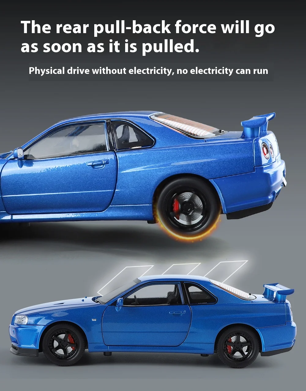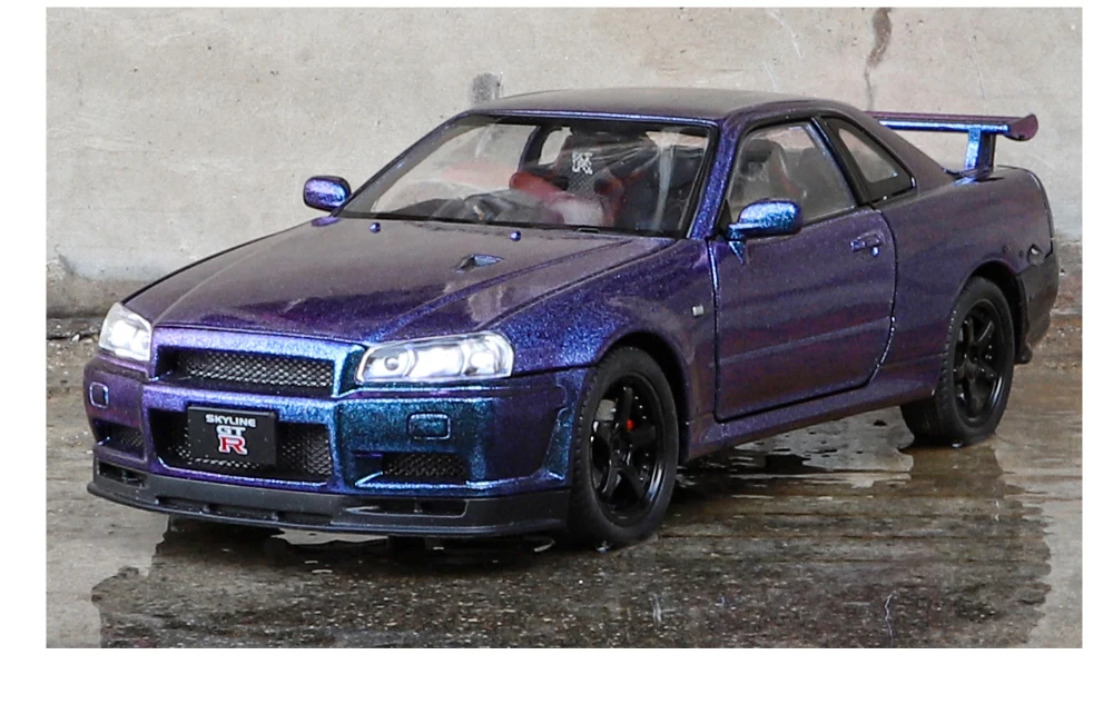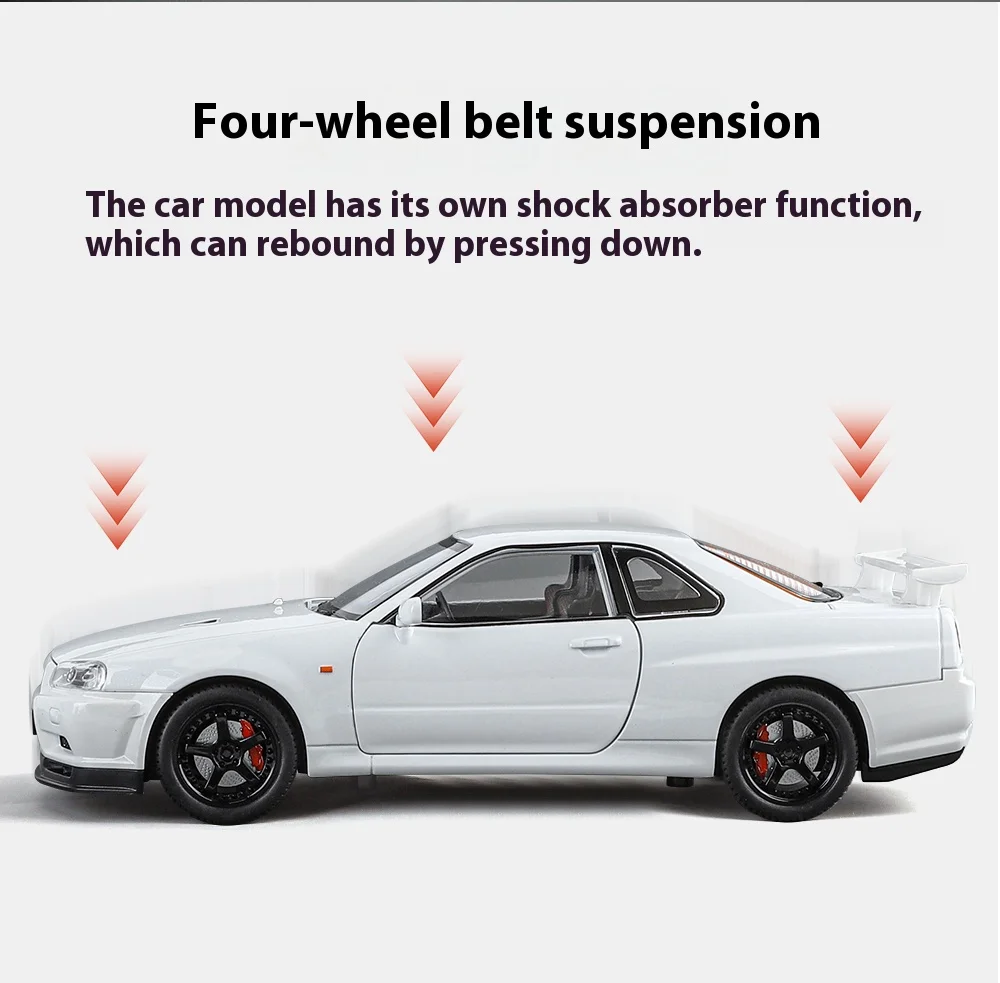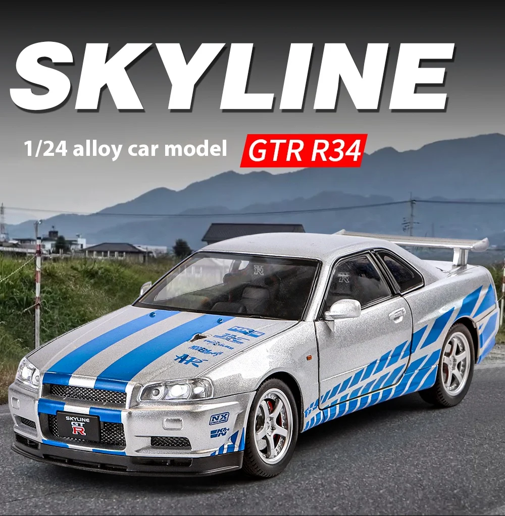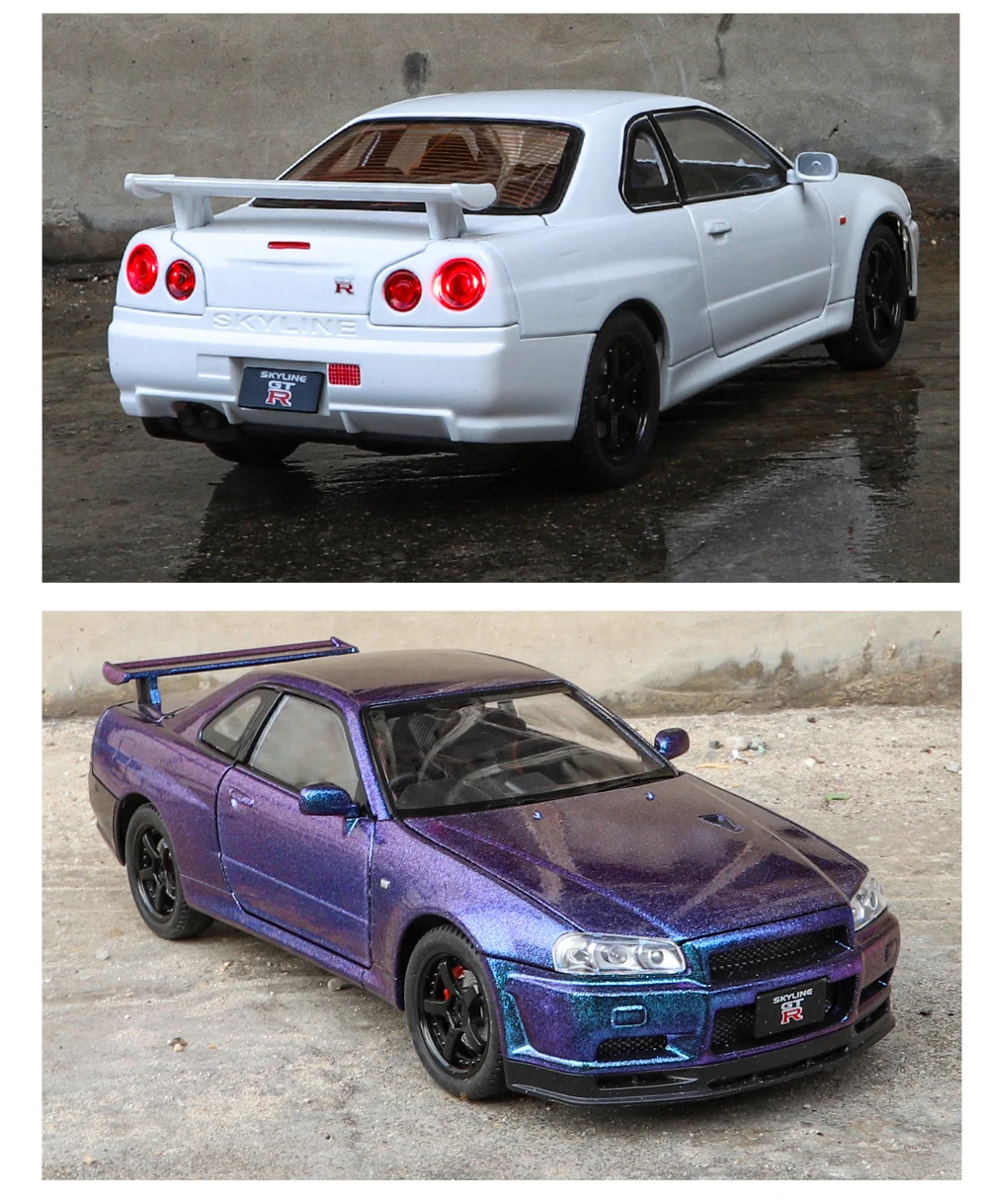 1:24 GTR R34 Skylin Diecast Modèle En Métal De Voiture Son Et Lumière Tirer Supercar Sport Racing Collection Loisirs Vacances Cadeau Garçon