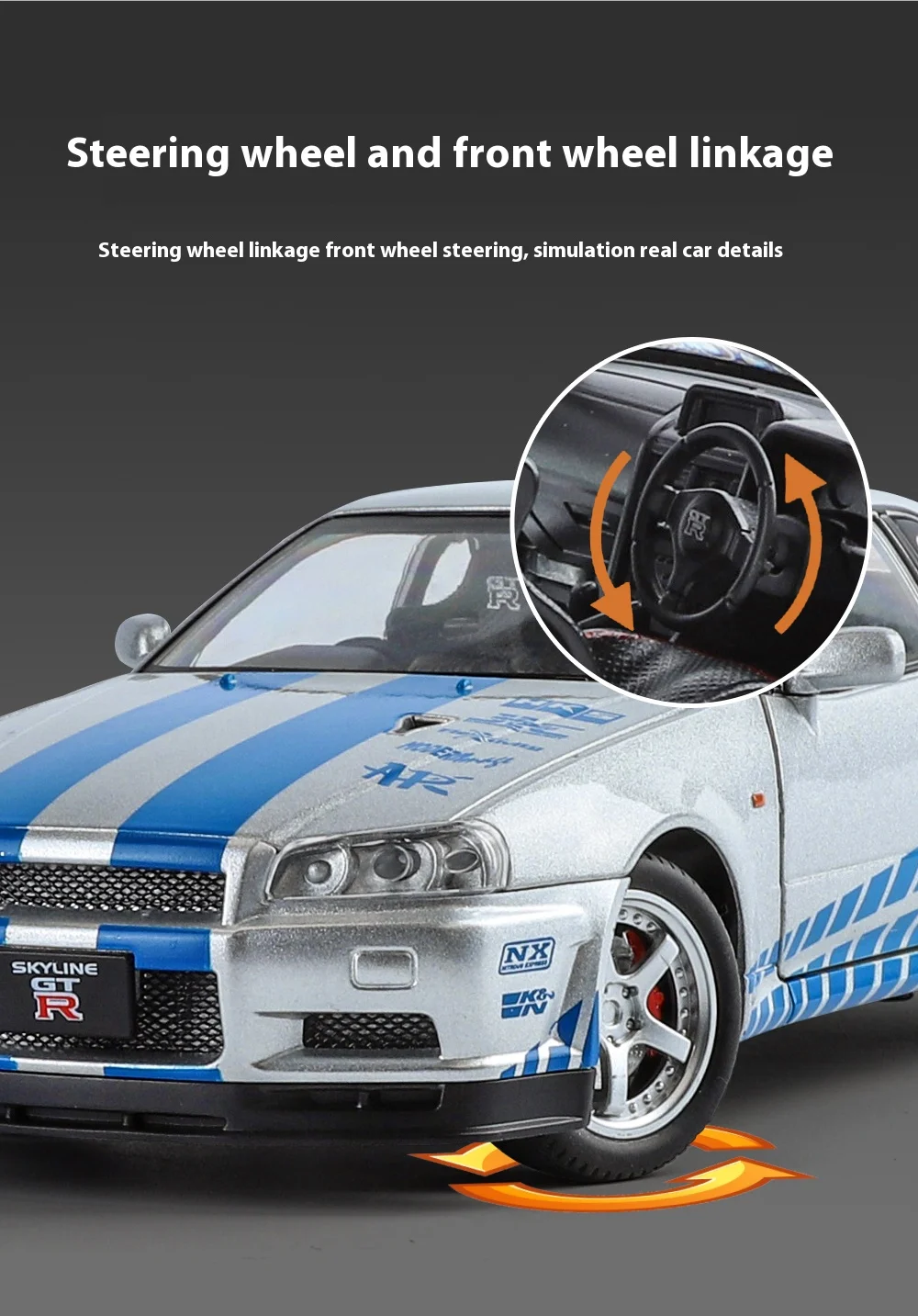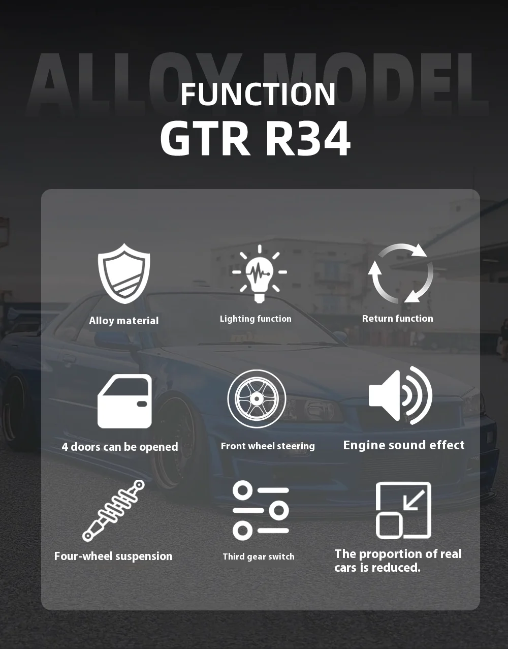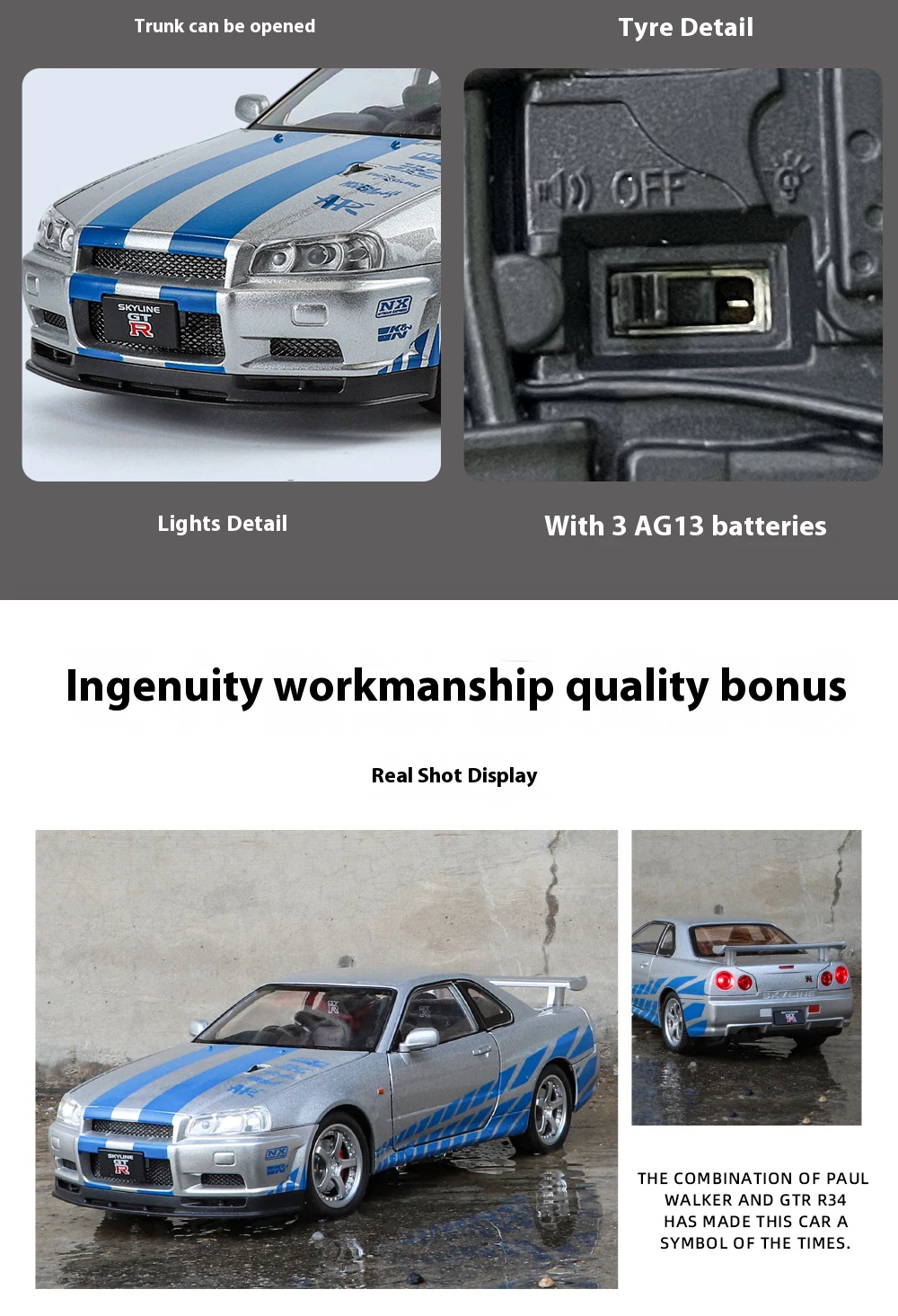 1:24 GTR R34 Skylin Diecast Modèle En Métal De Voiture Son Et Lumière Tirer Supercar Sport Racing Collection Loisirs Vacances Cadeau Garçon