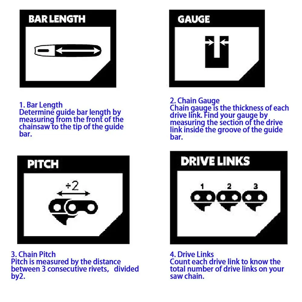 - La même scie peut être équipée de différentes longueurs de barre.Veuillez vérifier vos paramètres pour vous assurer que cette chaîne fonctionne avec votre machine.