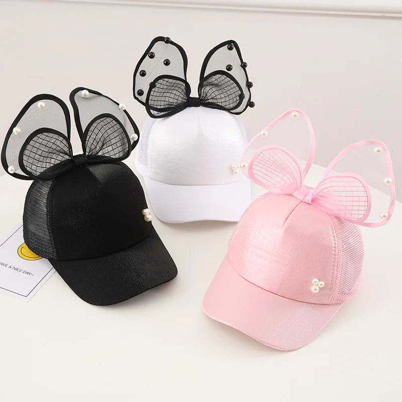 Casquette de baseball avec nœud papillon doux pour filles, grande maille, casquette à visière pour bébé, coton réglable, chapeaux de soleil pour tout-petits, été