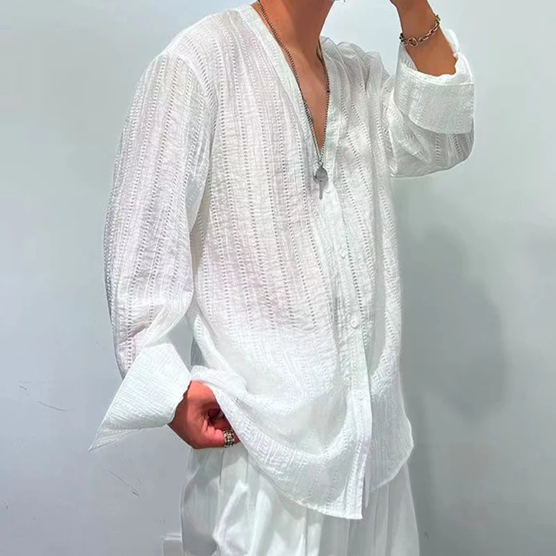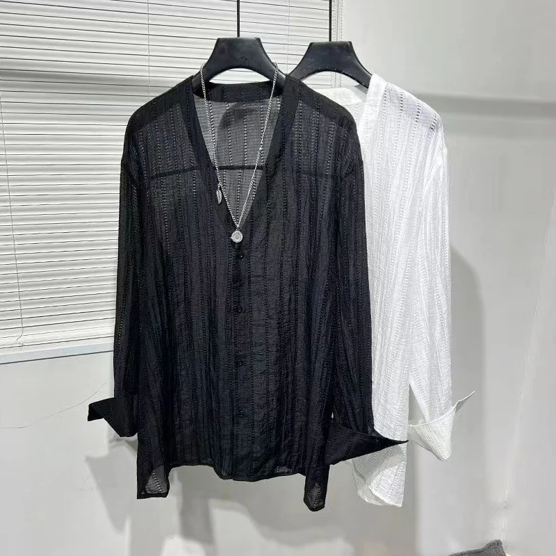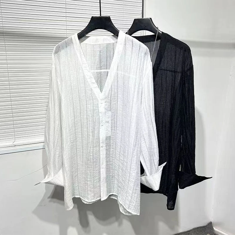 Chemise en maille transparente à col en V pour hommes, chemise à manches longues, chemise boutonnée en dentelle pure, chemises streetwear sexy, printemps, Y-2024