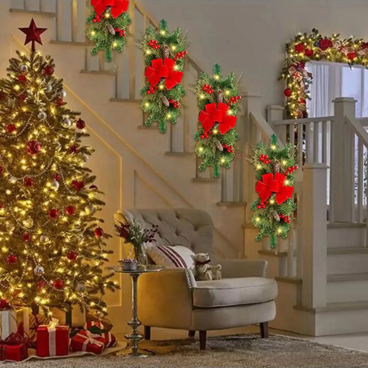 Guirlande de Noël Décoration LED Escalier Rouge Rotin Arc Guirlande Pomme De Pin Décoration Nouvelle Guirlande De Noël Pomme De Pin Décoration