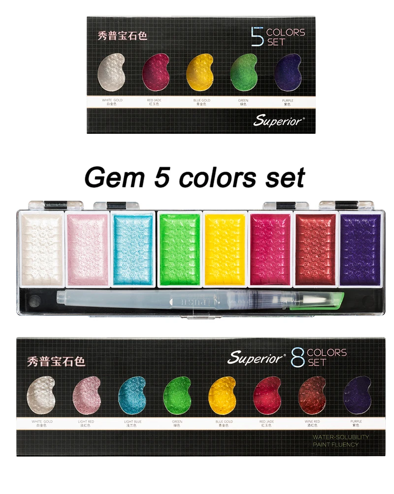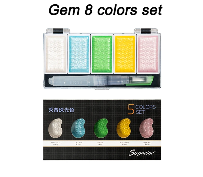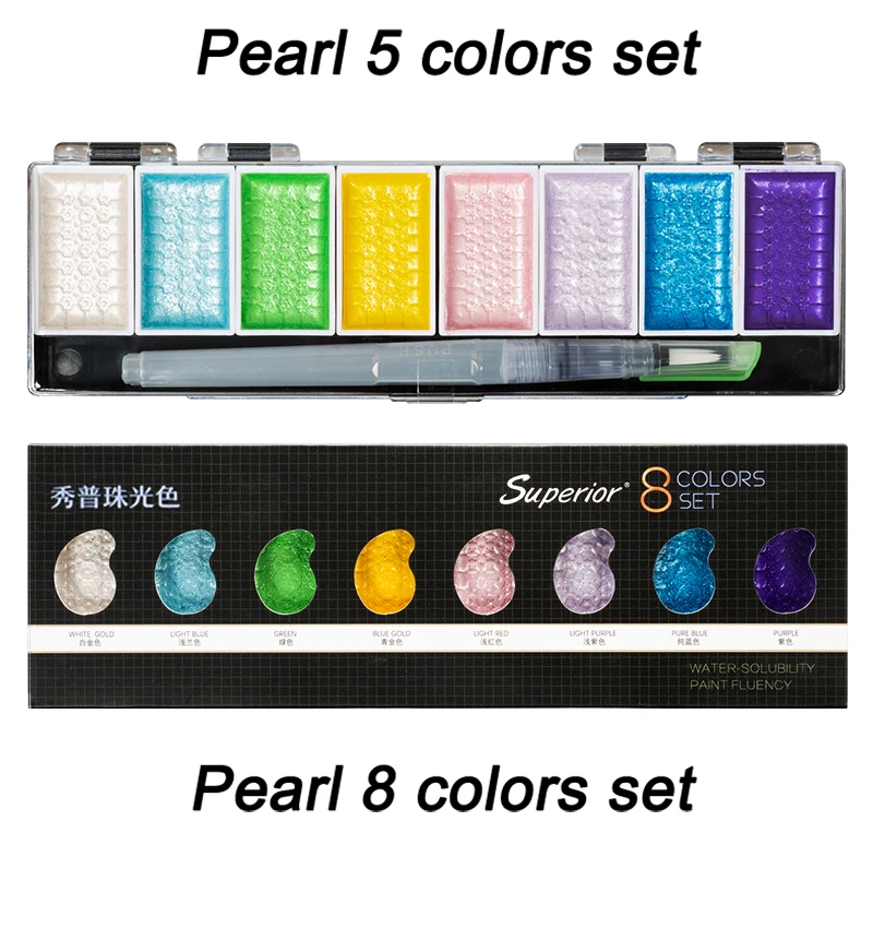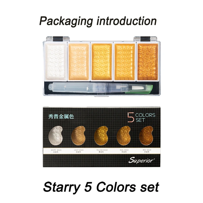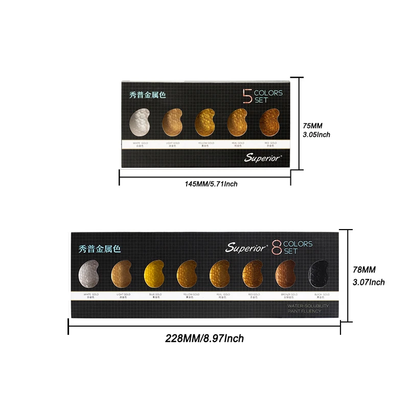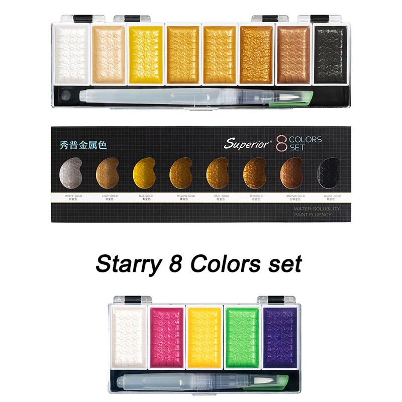 Ensemble de peinture à l'eau solide avec pinceau pour artiste, aquarelle, pigment doré métallique, fournitures d'art, qualité supérieure, 5 couleurs, 8 couleurs