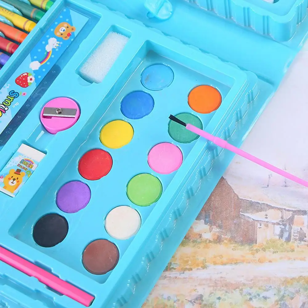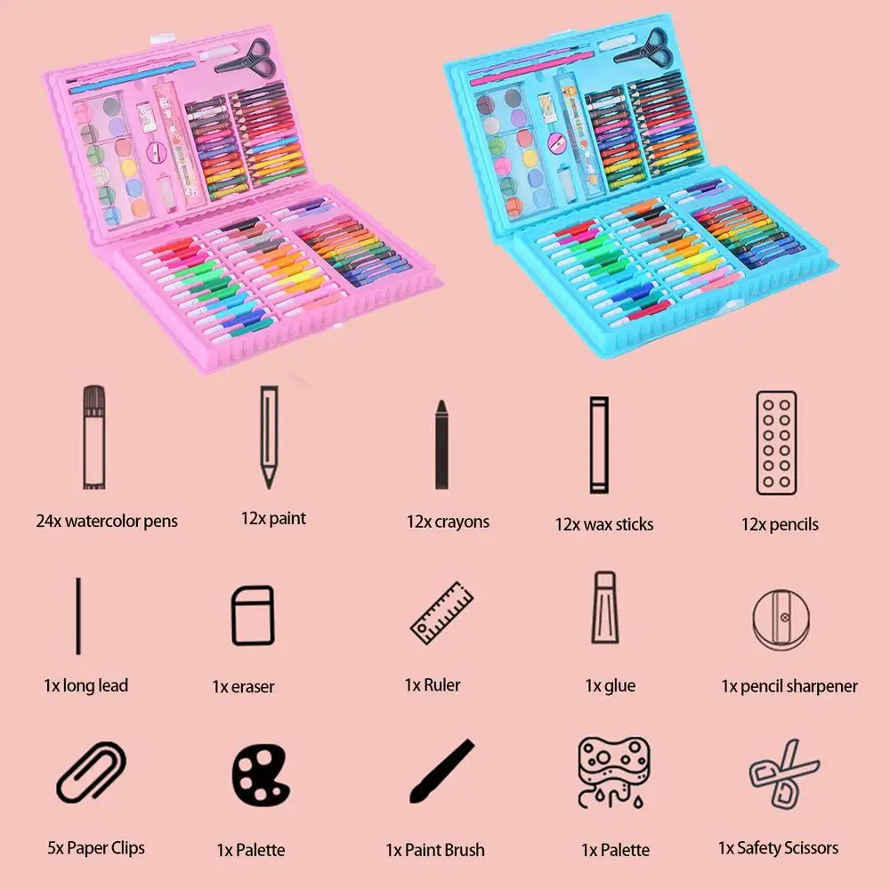 1 x Kit d'outils de peinture (24 stylos à aquarelle, 12 crayons de couleur, 12 bâtons de cire de couleur, 12 crayons de couleur, 12 couleurs de peinture, 1 taille-crayon, 1 gomme, 1 bouteille de colle, 1 longue laisse, 1 éponge, 1 règle, 1 ciseaux de sécurité, 1 palette, 1 pinceau, 5 trombones)