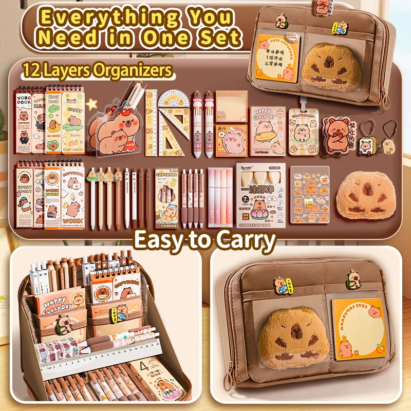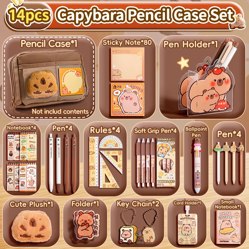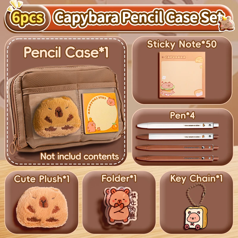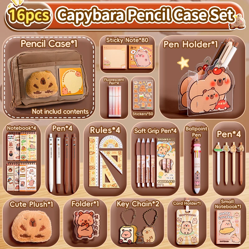 Ensemble de trousse à crayons Capybara avec fournitures, Kit de papeterie 6/9/14/16 pièces, comprend un support, une stylo, un porte-clés, des autocollants, une broche, des Clips pour Hobbis