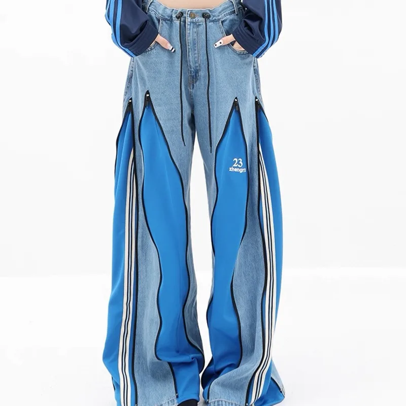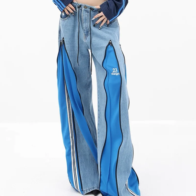 [EWQ] décontracté mode Style femmes Unique Denim pantalon Patchwork contraste couleurs jean conception fermeture éclair pantalon à jambes larges 16O7157