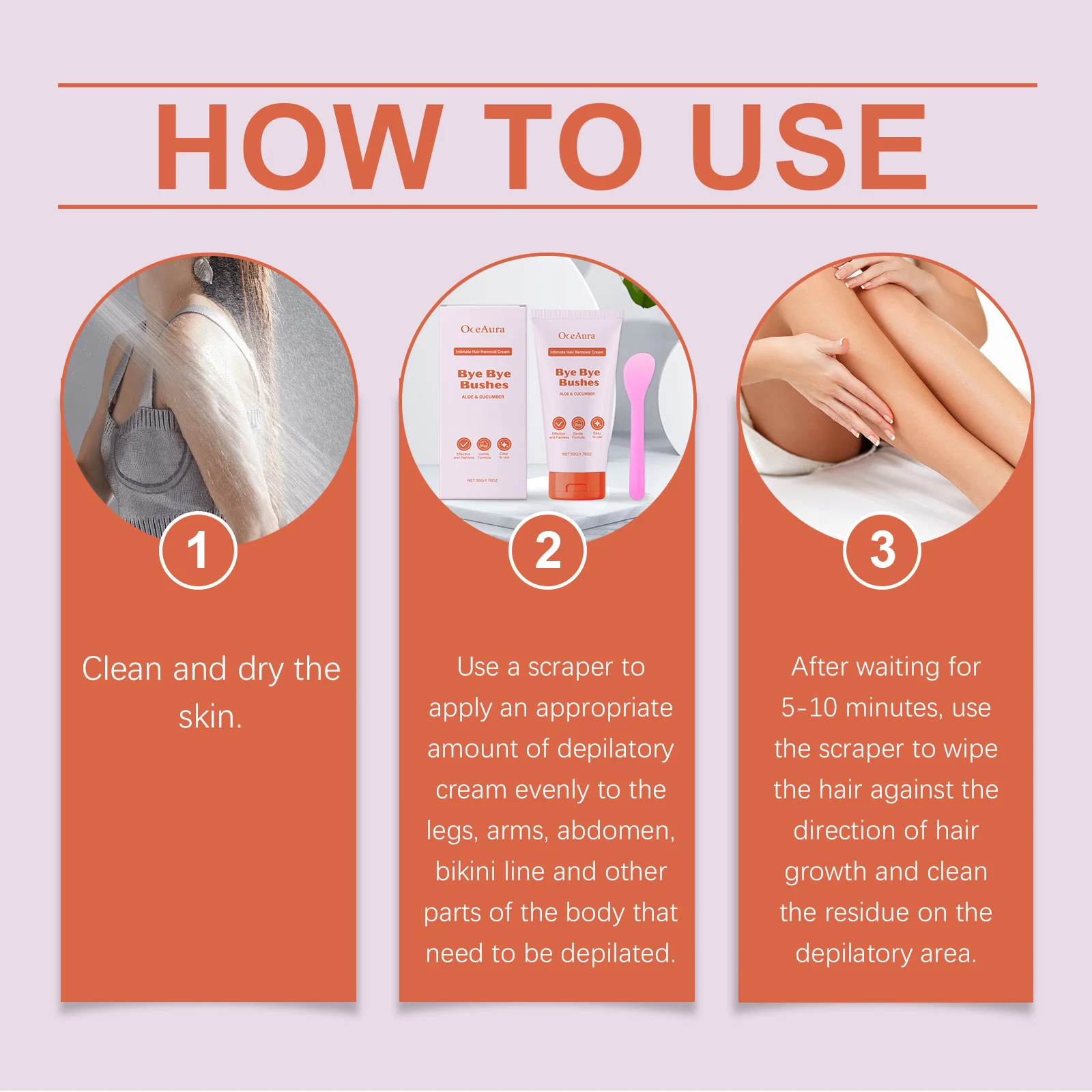 2.Utilisez un grattoir pour appliquer uniformément une quantité appropriée de crème dépilatoire sur les jambes, les bras, l'abdomen, la ligne du bikini et d'autres parties du corps qui doivent être épilées.
