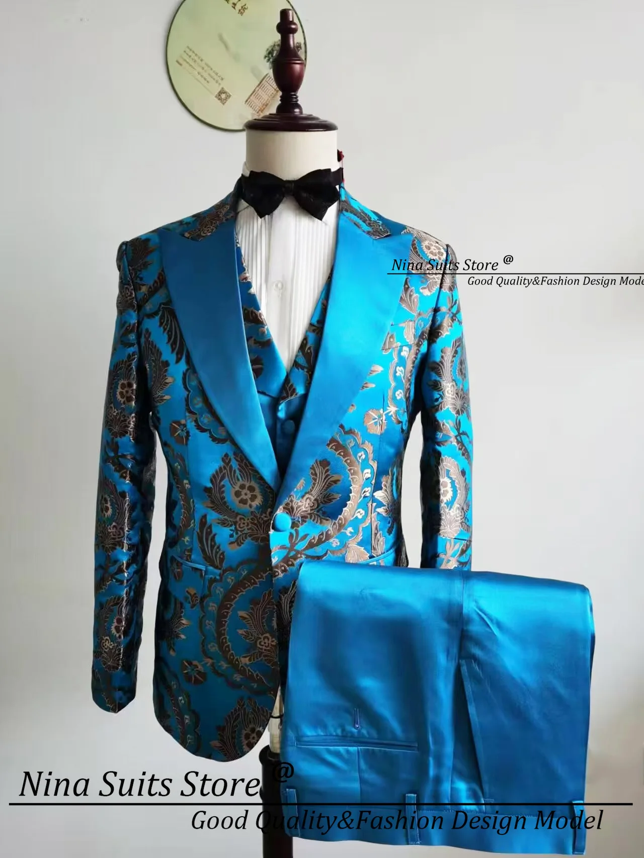 G & N-Smokings de soirée pour homme, ensemble 3 pièces, blazer sur mesure, revers Patricia, un bouton, bleu lac, brume dorée, zones florales, luxe, 2025
