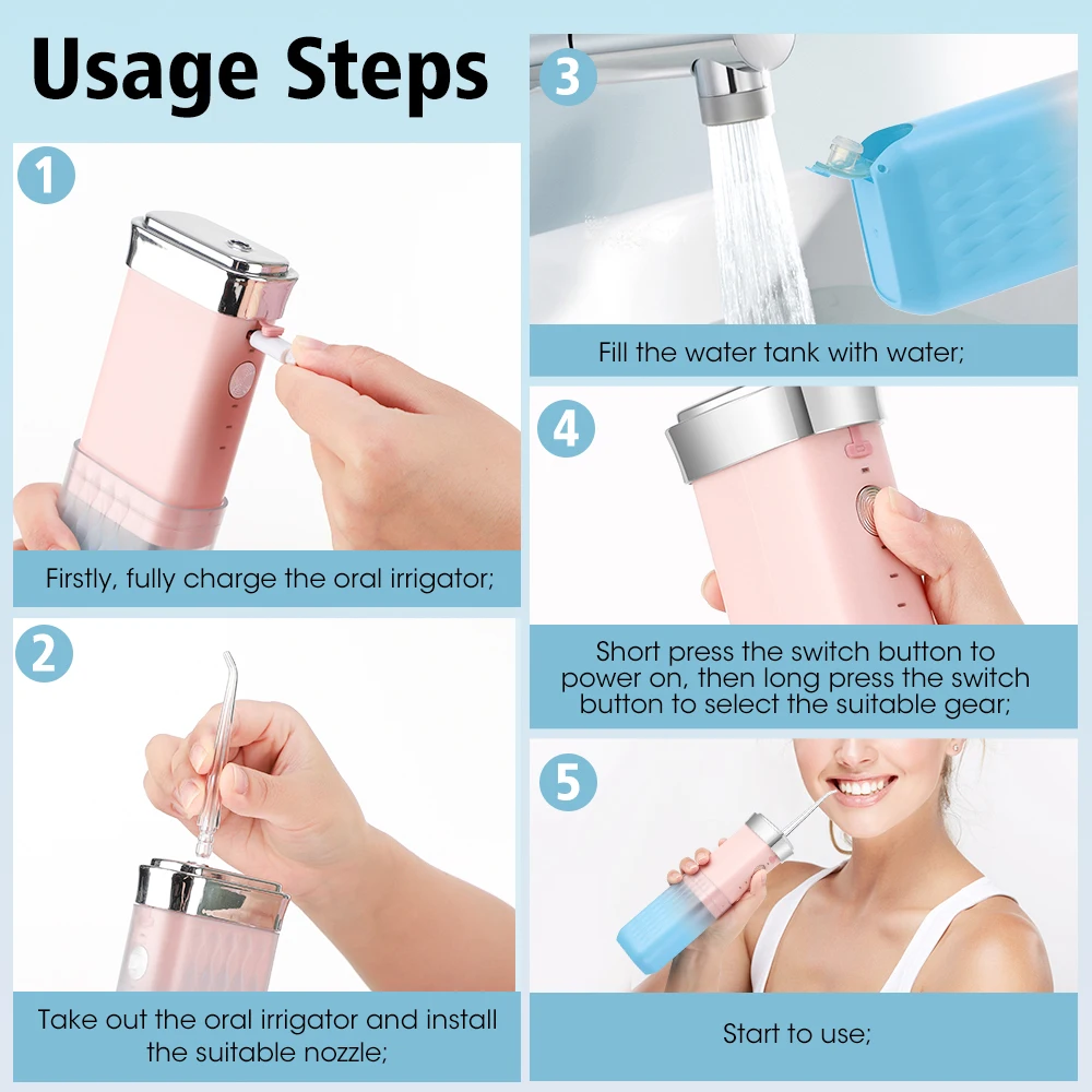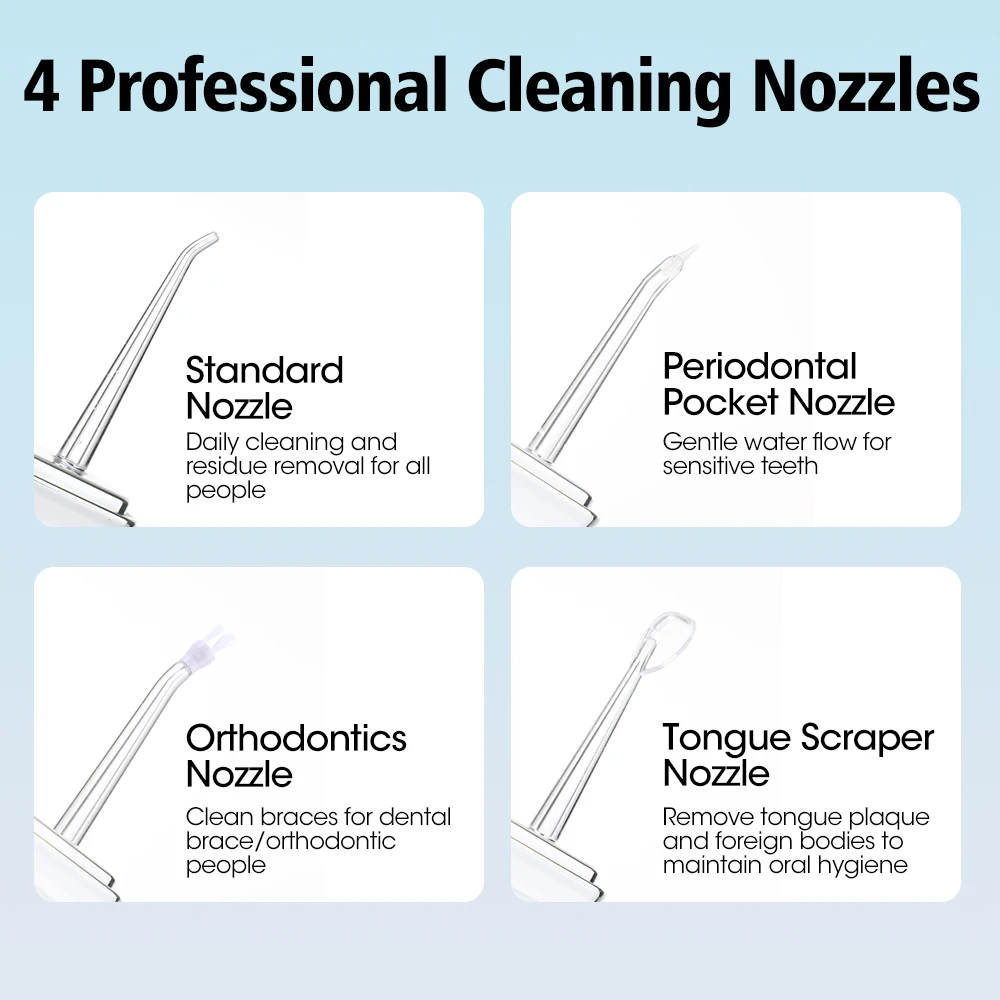 6.Cet irrigateur oral sans fil est équipé de 4 buses professionnelles : une buse standard pour le nettoyage quotidien et l'élimination des résidus, adaptée à tous les utilisateurs ;une buse de poche parodontale avec un débit d'eau doux pour les dents sensibles ;une buse orthodontique pour nettoyer les appareils orthodontiques sur mesure pour les personnes orthodontiques ;et une buse gratte-langue pour éliminer la plaque dentaire et les corps étrangers afin de maintenir l'hygiène bucco-dentaire.