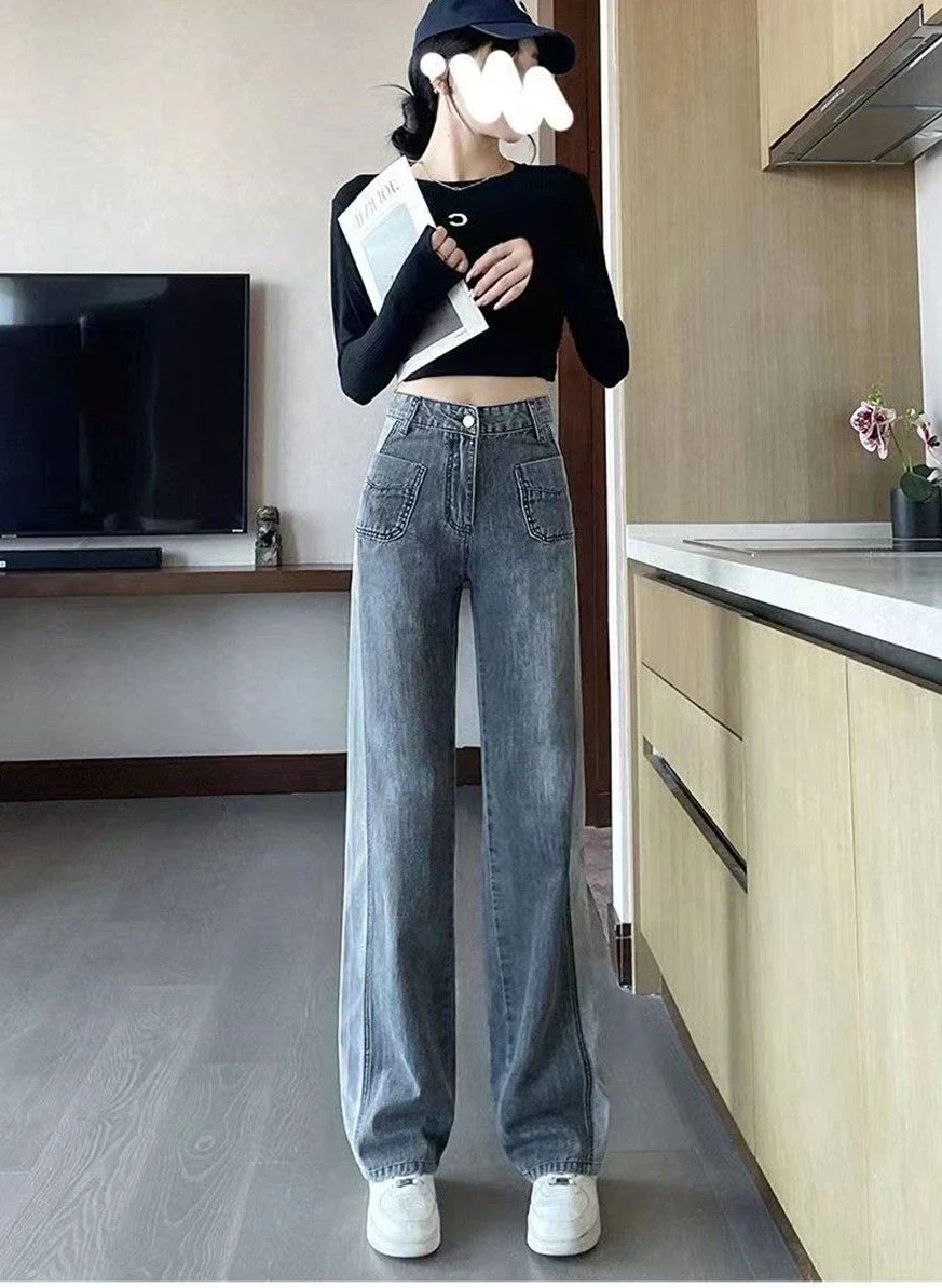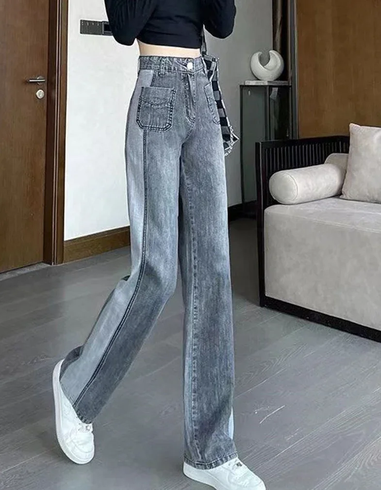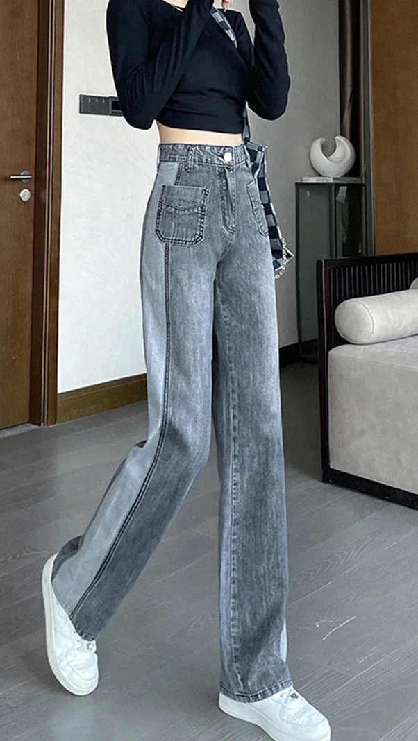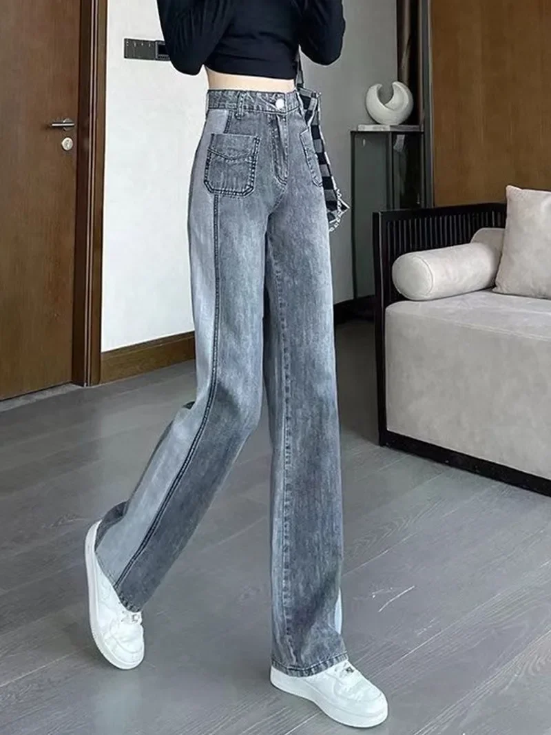 Jean Gris avec Poches pour Femme, Pantalon Taille Haute, Jambes Droites, FjStreetwear des Années 90, Chic et Élégant, Bon Marché
