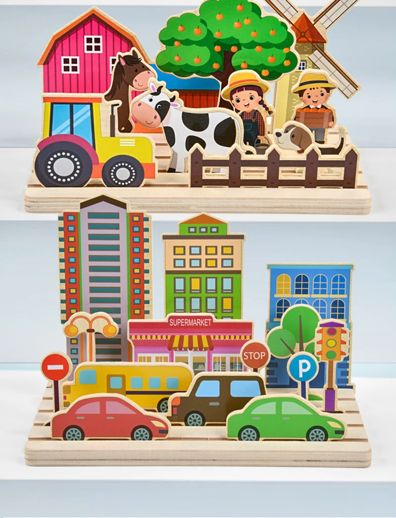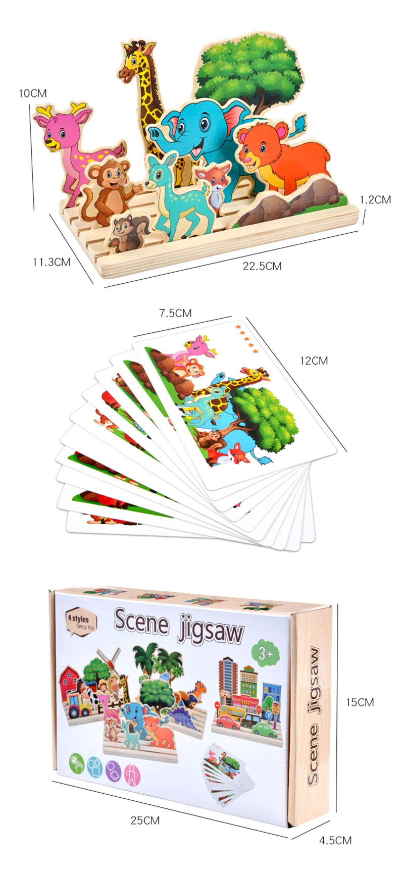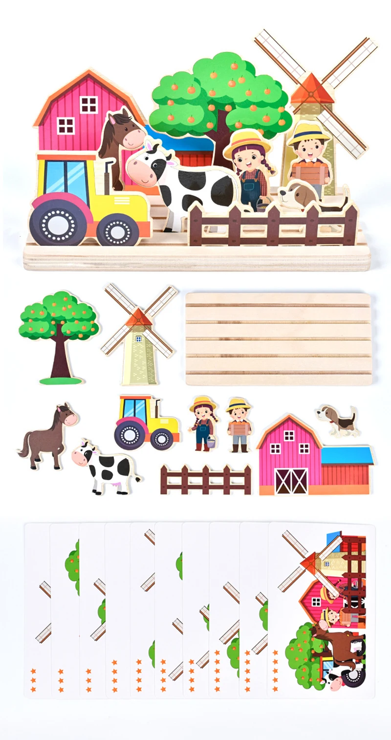 Jeu de pensée logique en bois pour enfants, puzzle de scène d'animaux de ferme, jeu de construction assorti, formation à l'imagination, jouets éducatifs Montessori