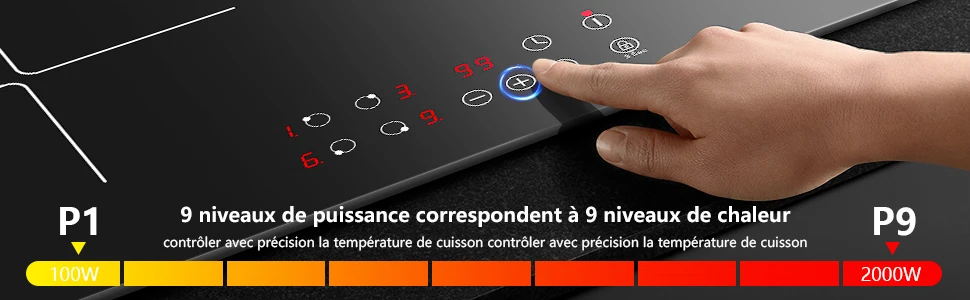 Contrôle de puissance à 9 niveaux, boost, avertissement de chaleur résiduelle, verrouillage enfant, minuterie, écran tactile.