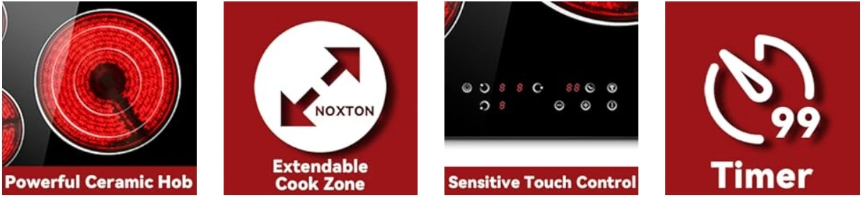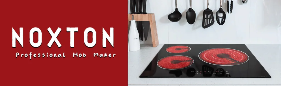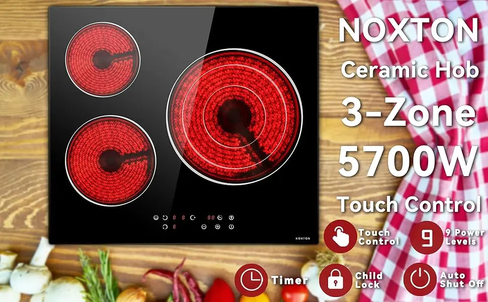 NOXTON Plaque de cuisson en céramique intégrée 3 feux, Table de cuisson électrique en verre cristal noir avec commande tactile, Minuterie, verrouillage pour enfants, 5700w, pas de prise incluse