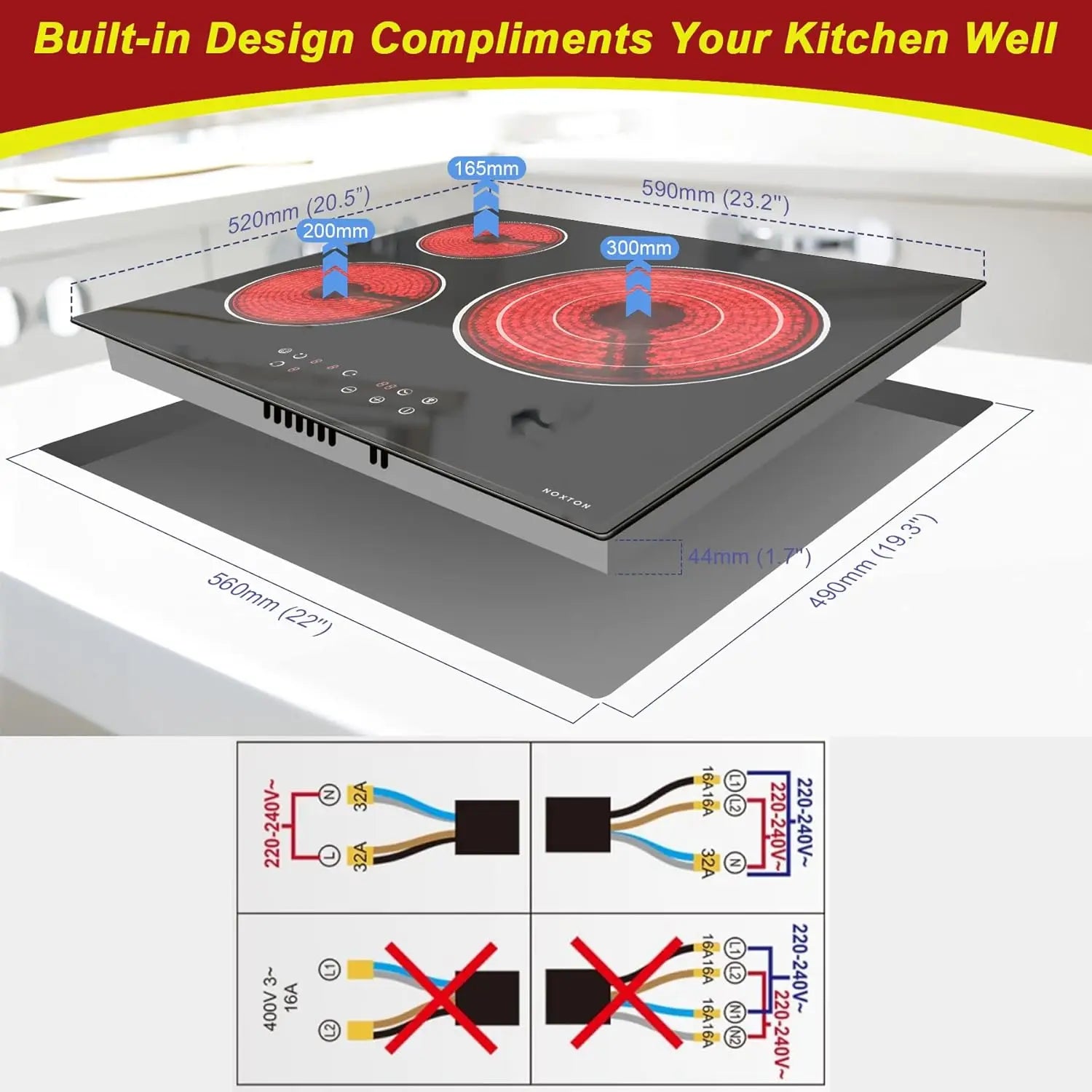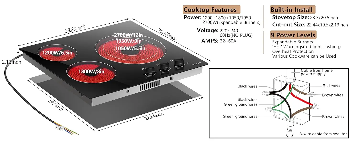 Table de cuisson électrique intégrée : ces grandes plages haute puissance sont encastrées sans fiches et doivent être connectées à 220 ~ 240 V. Le montage encastré permet d'économiser de l'espace et grâce au verre lisse noir, il donne à l'ensemble un aspect très maintenant et élégant. Ce type de poêle électrique en verre est également facile à nettoyer, il suffit de l'essuyer avec un chiffon humide. Taille du plateau : 23,3 pouces (590 mm) * 20.5ich (520 mm) * 54 mm (2,13 pouces), taille découpée : 22,44 pouces (570 mm) x 1,5 pouces (495 mm)