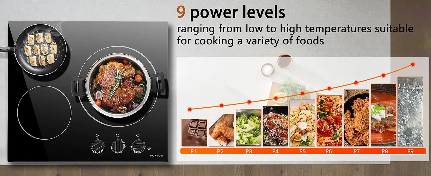 【Compatible avec tous les types d'ustensiles de cuisine】 Cette table de cuisson électrique en verre est très pratique à utiliser.Étant donné que n'importe quel matériau de casseroles et poêles peut être adapté à ce poêle électrique en céramique, vous devez vous assurer que le fond des casseroles et poêles est plat.Que vous souhaitiez griller sur une plaque chauffante, faire bouillir de la soupe dans une casserole ou saisir un steak dans une poêle.La table de cuisson électrique à 3 feux a 9 niveaux de puissance, donc quel que soit le type de cuisson que vous souhaitez, il y a toujours un niveau de chaleur qui vous convient!