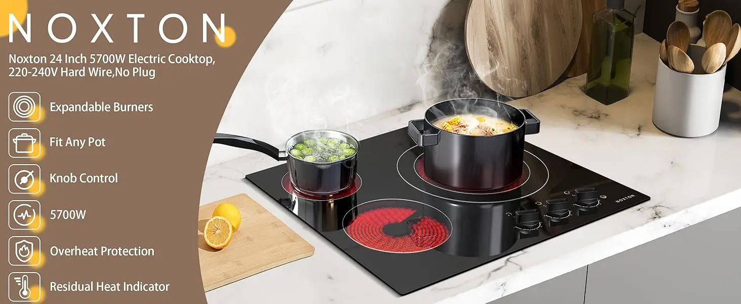 【Table de cuisson électrique à commande par bouton 3 brûleurs】 L'avantage exceptionnel de notre table de cuisson électrique 220 V 24" est la conception des boutons.Quatre boutons indépendants correspondent à quatre brûleurs, sans autres boutons extra compliqués, particulièrement adaptés aux personnes âgées ou aux personnes malvoyantes.Nous pensons qu'avec notre réchaud électrique en céramique de 24 pouces, tout le monde peut profiter de la cuisine avec cette table de cuisson électrique en céramique sans aucun obstacle!