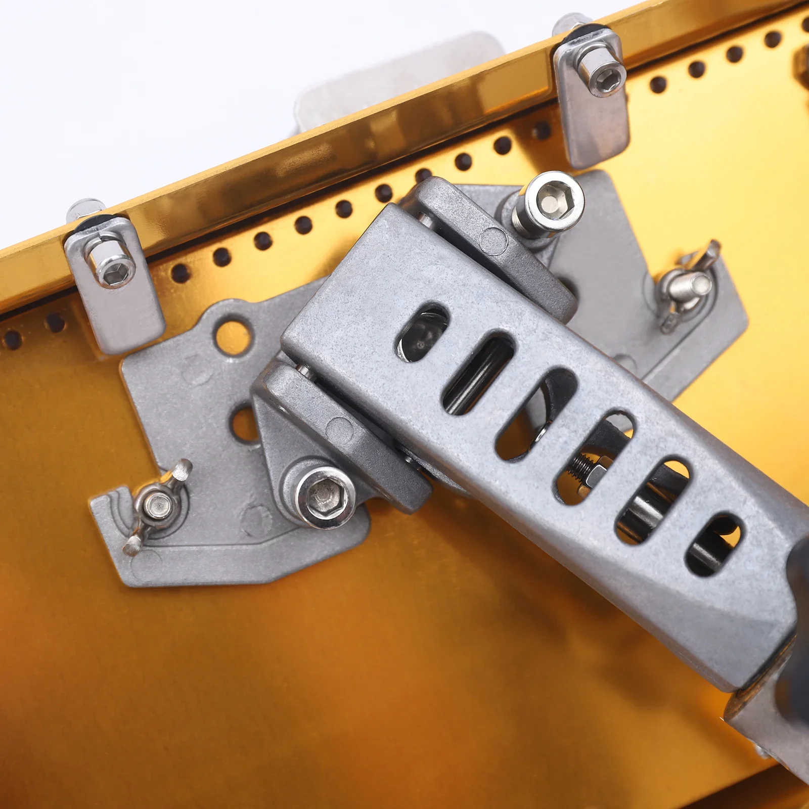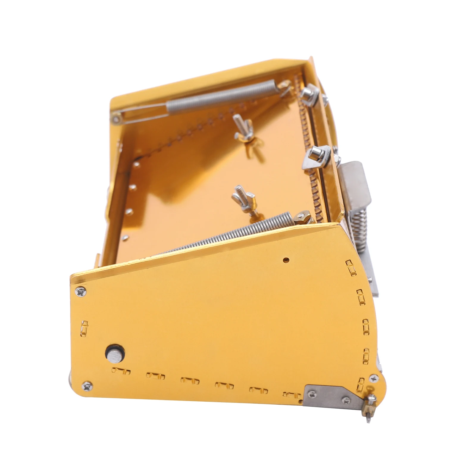 | Comment assembler et utiliser 1.Assurez-vous que la lame Plat Box est l'épaisseur d'un ongle (1-1,5 mm) au-dessus des patins.la lame peut être ajustée à l'aide des vis sur le porte-lame pour obtenir la hauteur nécessaire ; 2.Testez que le support de lame peut monter et descendre librement ; 3.Fixez la poignée de votre boîte Plat en la faisant glisser dans la boîte et en serrant les deux écrous à oreilles ; 4.Ajustez la tension sur le porte-lame en fonction de la jauge du composé qui doit être utilisé dans la machine ; 5.Assemblez avec la poignée. 6.Placez la boîte à un léger angle de la poignée et serrez le bouton pour fixer l'angle, afin que la tête reste stationnaire. 7.Placez la boîte à plat sur le joint et tout en appliquant une pression, relâchez le bouton permettant à la boîte et à la poignée de trouver sa propre position naturelle. 8.Ajustez la longueur de la poignée : appuyez sur le bouton pour prolonger la longueur (max.63.8'') |