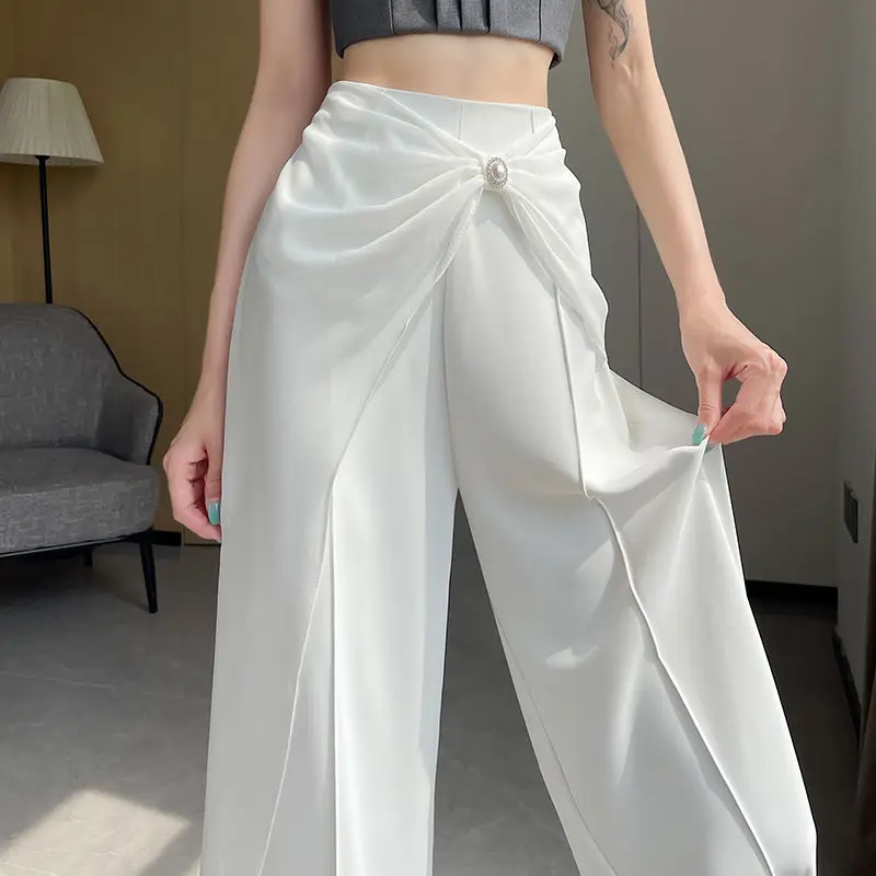 Pantalon à jambes larges en mélange de mousseline de soie pour femmes, taille haute, jambe droite, longueur au sol