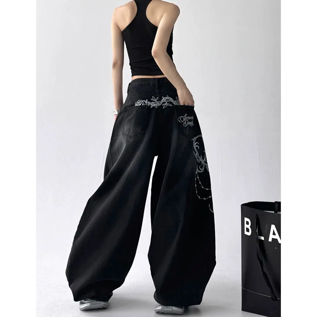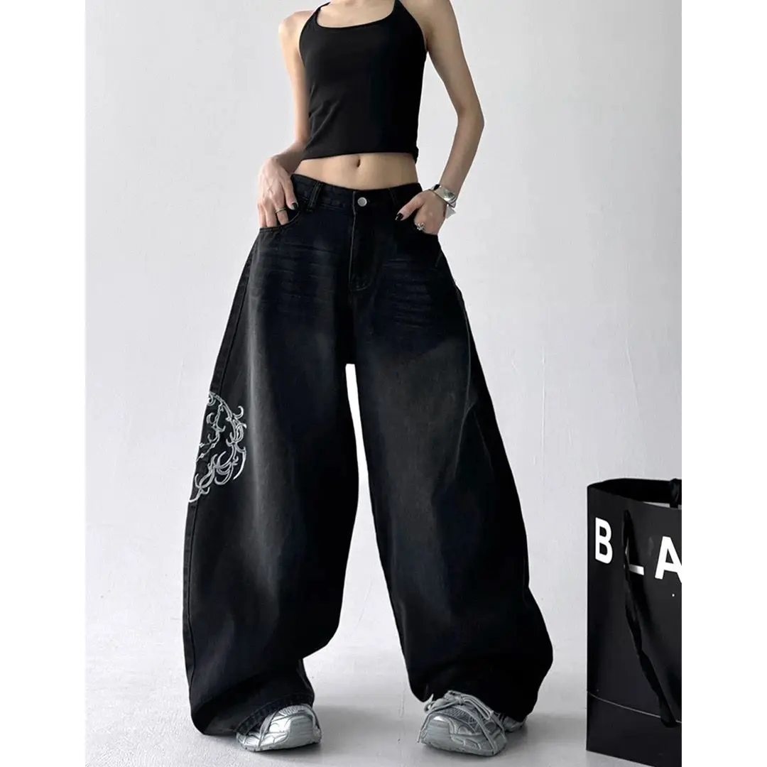 Rue rétro ligne américaine modèle jean décontracté femmes 2025 été nouvelle mode taille haute ample jambe large jean Biack Y2K jean