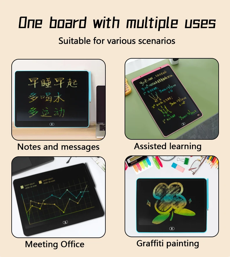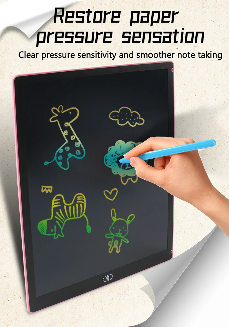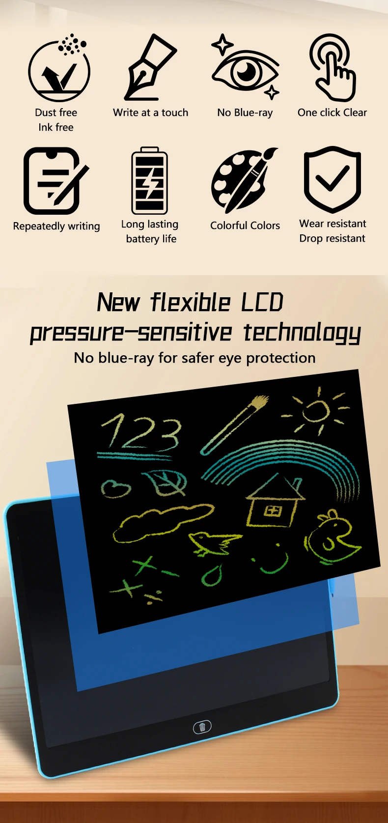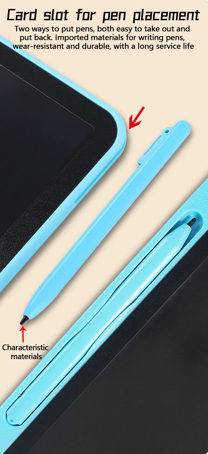 Information sur le produit Grande tablette graphique LCD de 8,5/10/12/16 pouces Nom : tablette d'écriture LCD Matériel: ABS + écran LCD Âge approprié : 3 ans et plus Alimentation : 1 * pile bouton Type d'écran : écran flexible Genre : Unisexe Taille du produit: 8,5/10/12/16 pouces Couleur du produit : comme indiqué sur l'image, il peut y avoir de légères erreurs de couleur en raison de l'influence de l'environnement photographique et de la luminosité de l'écran. Liste de colisage : * 1 tablette d'écriture LCD * 1 stylo d'écriture POM Caractéristiques : 1.Le tableau d'écriture LCD a plusieurs couleurs, qui peuvent répondre aux préférences de couleur de la plupart des enfants.La taille est pratique à transporter. 2. Équipé d'un interrupteur de verrouillage supprimé, qui peut être basculé pour basculer entre les fonctions de verrouillage/suppression.Lors de l'écriture, l'interrupteur de verrouillage peut empêcher la suppression accidentelle des travaux.L'interrupteur de suppression permet de retirer facilement tous les graffitis, ce qui facilite la recréation des enfants. Remarque : En raison des différents paramètres d'éclairage et d'écran, la couleur de l'article peut être légèrement différente de celle de l'image. En raison des différentes mesures manuelles, veuillez permettre une différence de taille de 1 à 2 cm (0,39-0,79 pouces).