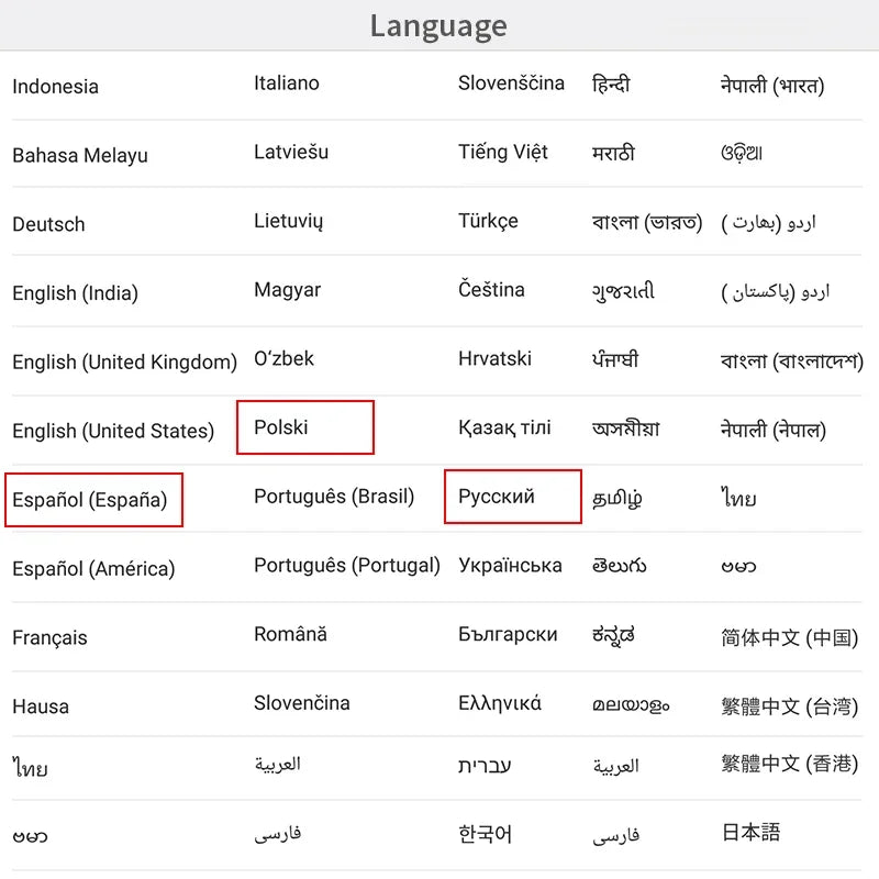 Langue: Arabe,POLISH,Allemand,Russe,French,coréen,Norwegian,Portugais,Japonais,Turkish,Espagnol,ITALIAN,english,english,Russe,Allemand,French,Espagnol,POLISH,Portugais,ITALIAN,Turkish,coréen,Japonais,Arabe